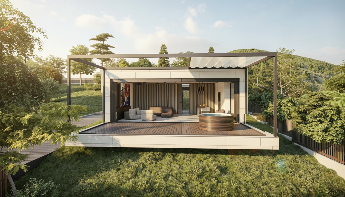change time of day to late dusk add warm lighting to the vertical lights between the garage doors and also as backlighting around the logo sign change reflection in windows to a simple night sky