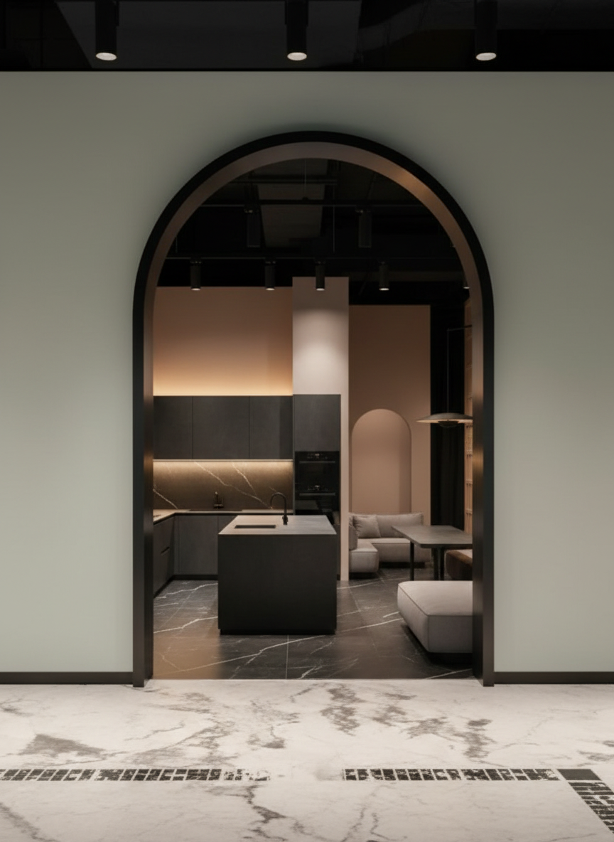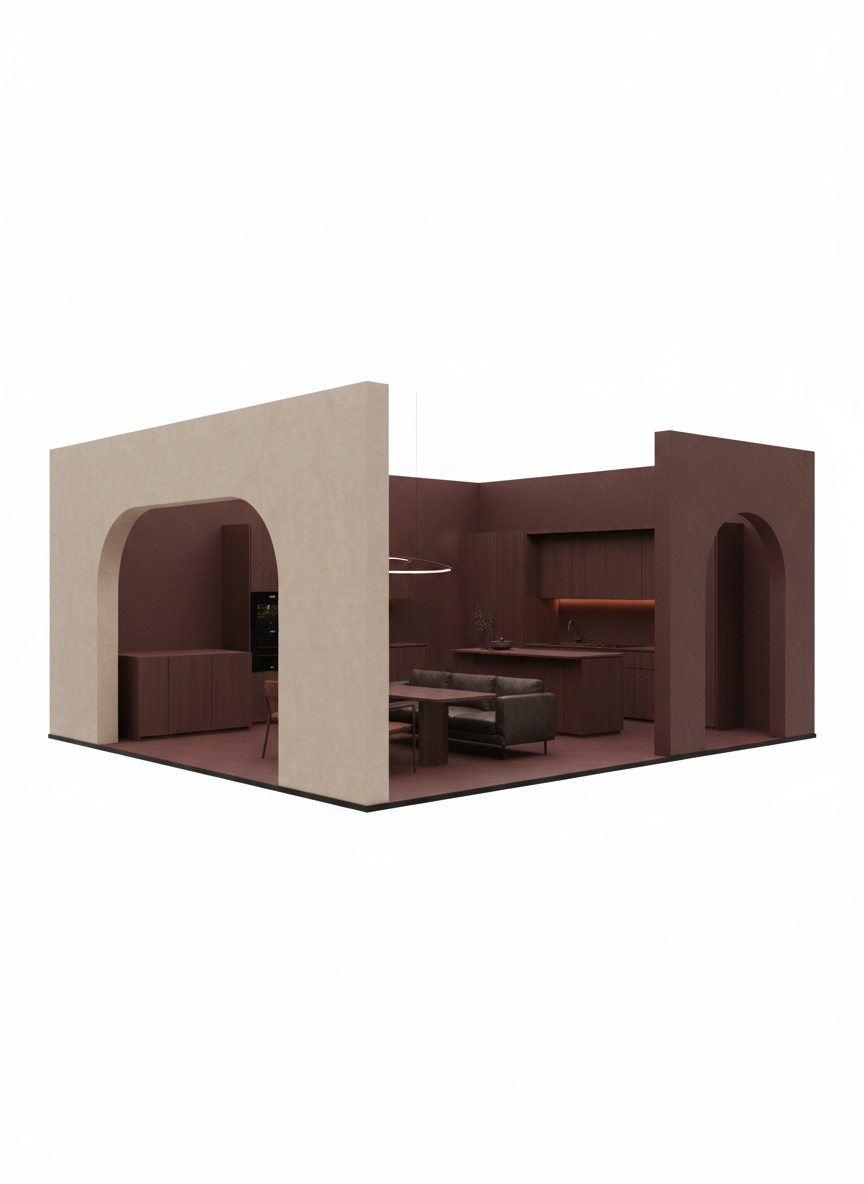 seen from above conceptual trade show booth architecture 20x30 footprint minimal massing blocks emphasis on circulation and pause architectural discipline soft light human scale no product display no ornament no color or material wall height 12 feet reserve a closed in space 50 to 80 square feet a single main entrance 10 to 12 feet wide on one 30 wall one secondary entrance as an exit 8 feet wide use arches for entrances mainly closed to the outside entry only hints at what is inside what is inside is a showstopper kitchen with meeting areas that feel like a speakeasy