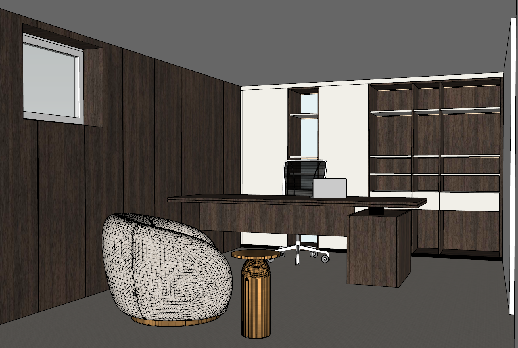 minimalist office accesories on desk picture frame on wall light on ceiling