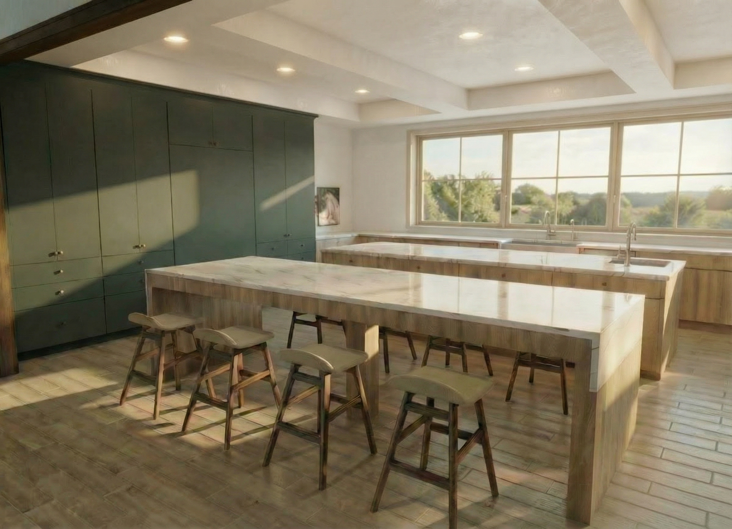 render a spacious modern kitchen interior with a warm inviting atmosphere use natural sunlight streaming through large windows casting soft shadows the color palette includes sage green cabinets light wood countertops and warm beige marble surfaces highlight the wooden stools at the counter with a medium walnut finish the walls are painted in a soft eggshell white and the floor is a light oak wood add recessed ceiling lights for a cozy ambiance the background through the window should show a serene sunny landscape with lush greenery