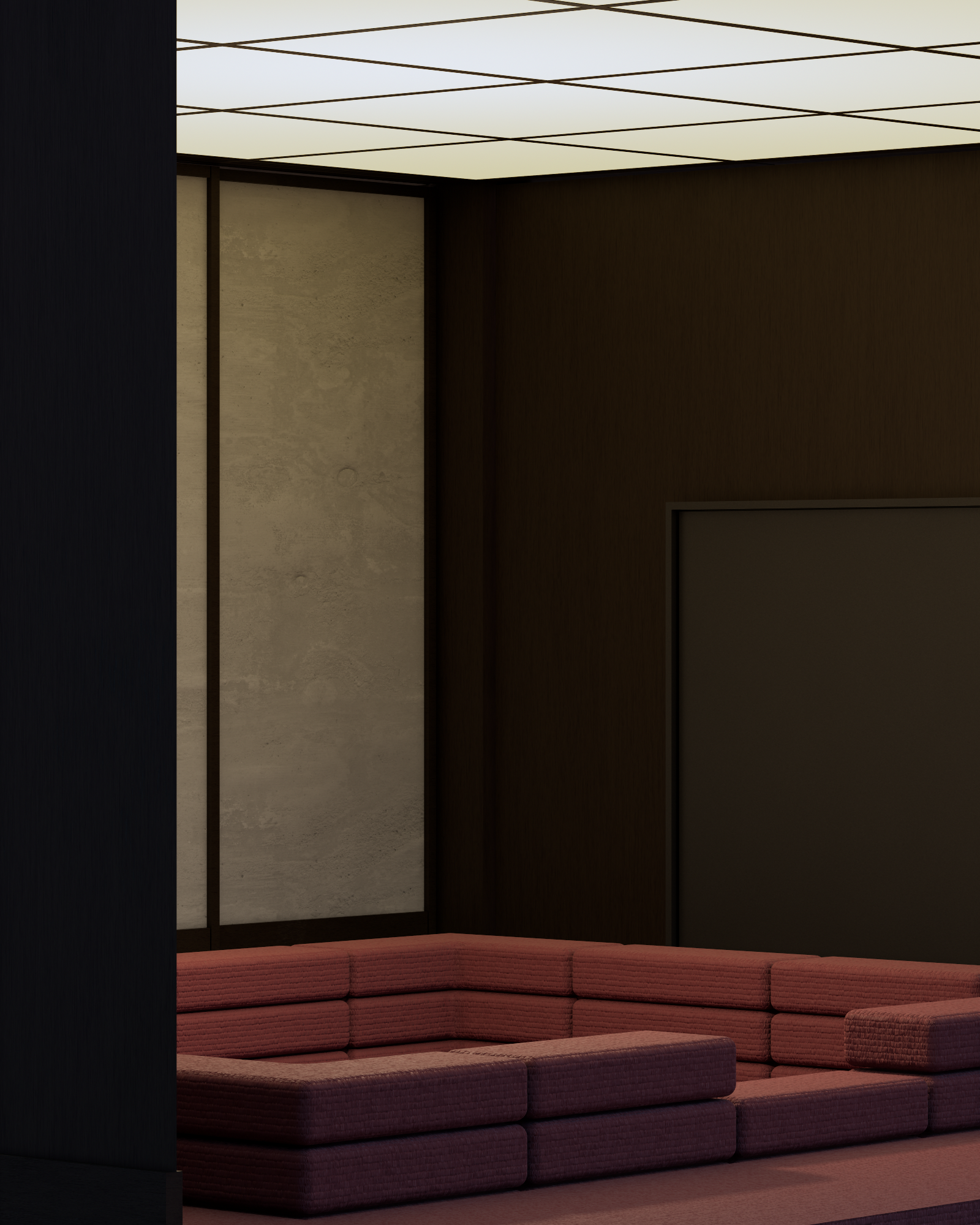 a modern minimalist living room centered around a recessed seating area with comfortable red cushions the soft ambient lighting from the gridded ceiling creates a warm inviting atmosphere a glass wall in the background reveals a serene sunset with pastel pink and orange hues adding tranquility the sleek dark brown walls and flooring provide a sophisticated contrast while reflections on the glossy surfaces enhance the room s elegance