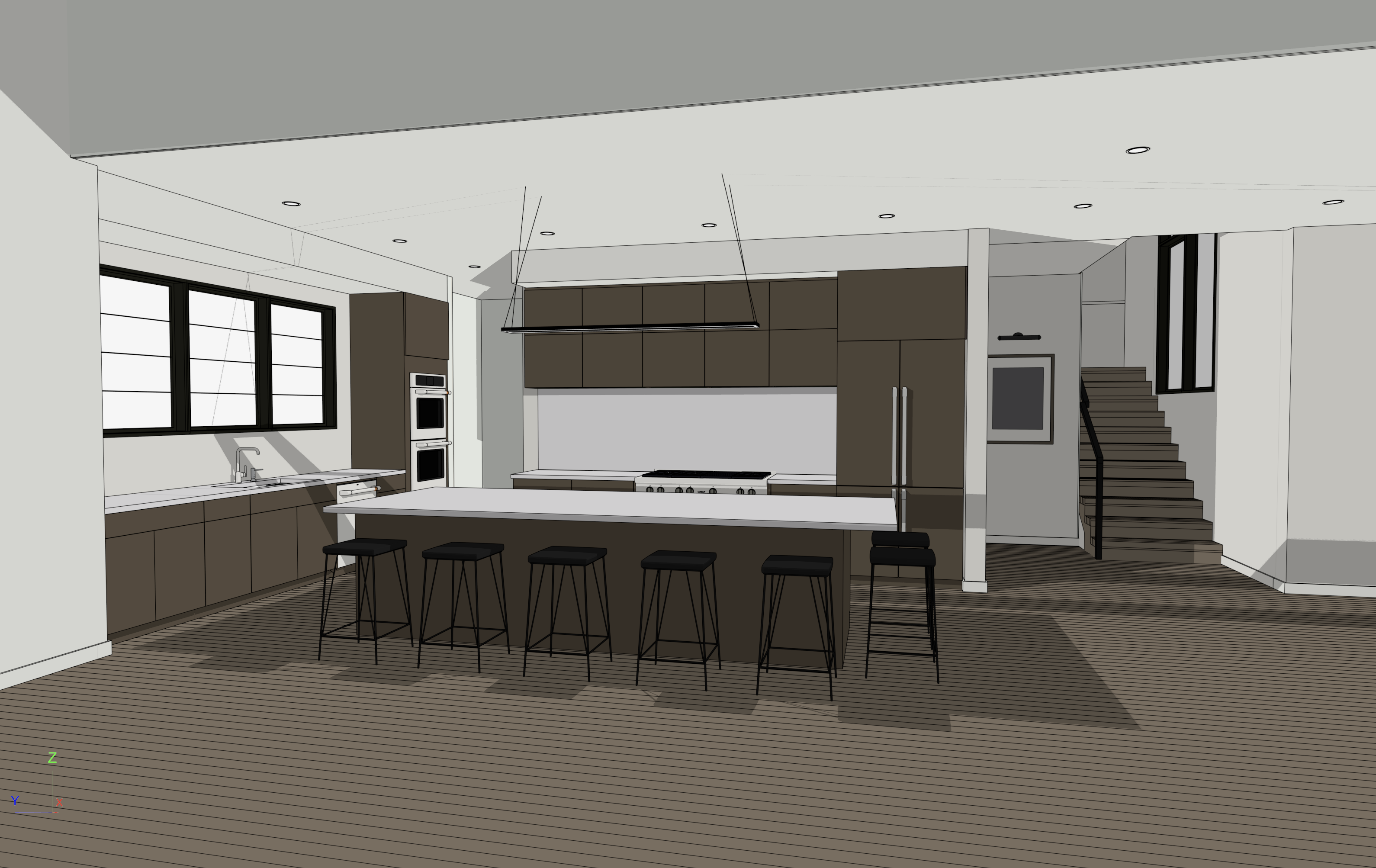 night shot make the countertops a honed grey quartz and the ovens dishwasher and cooktop stainless steel