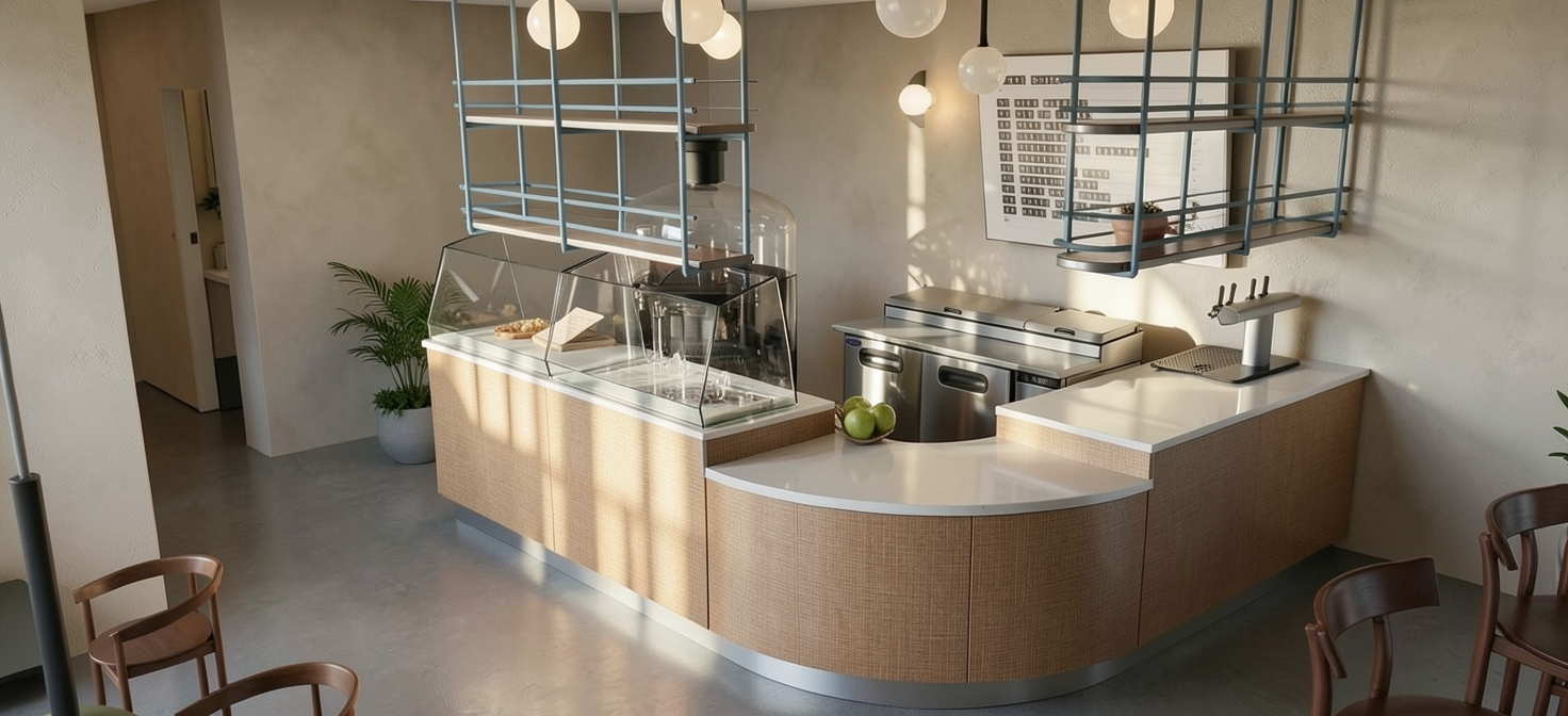 render a modern kitchen with a sleek minimalist design use a soft white for the cabinets and open shelves the countertops should be a smooth white stone texture add a metallic silver finish to the espresso machine for a touch of elegance paint the lower cabinets and oven area in a dark khaki muted green to complement the overall palette use a muted matte beige tile for the floor for contrast ensure the atmosphere feels cozy and inviting with natural daylight streaming through a large window casting subtle shadows and adding warmth to the scene