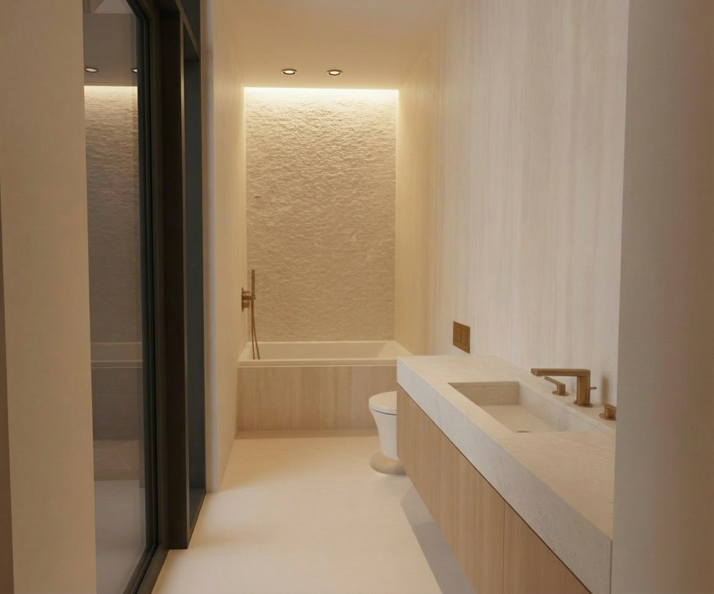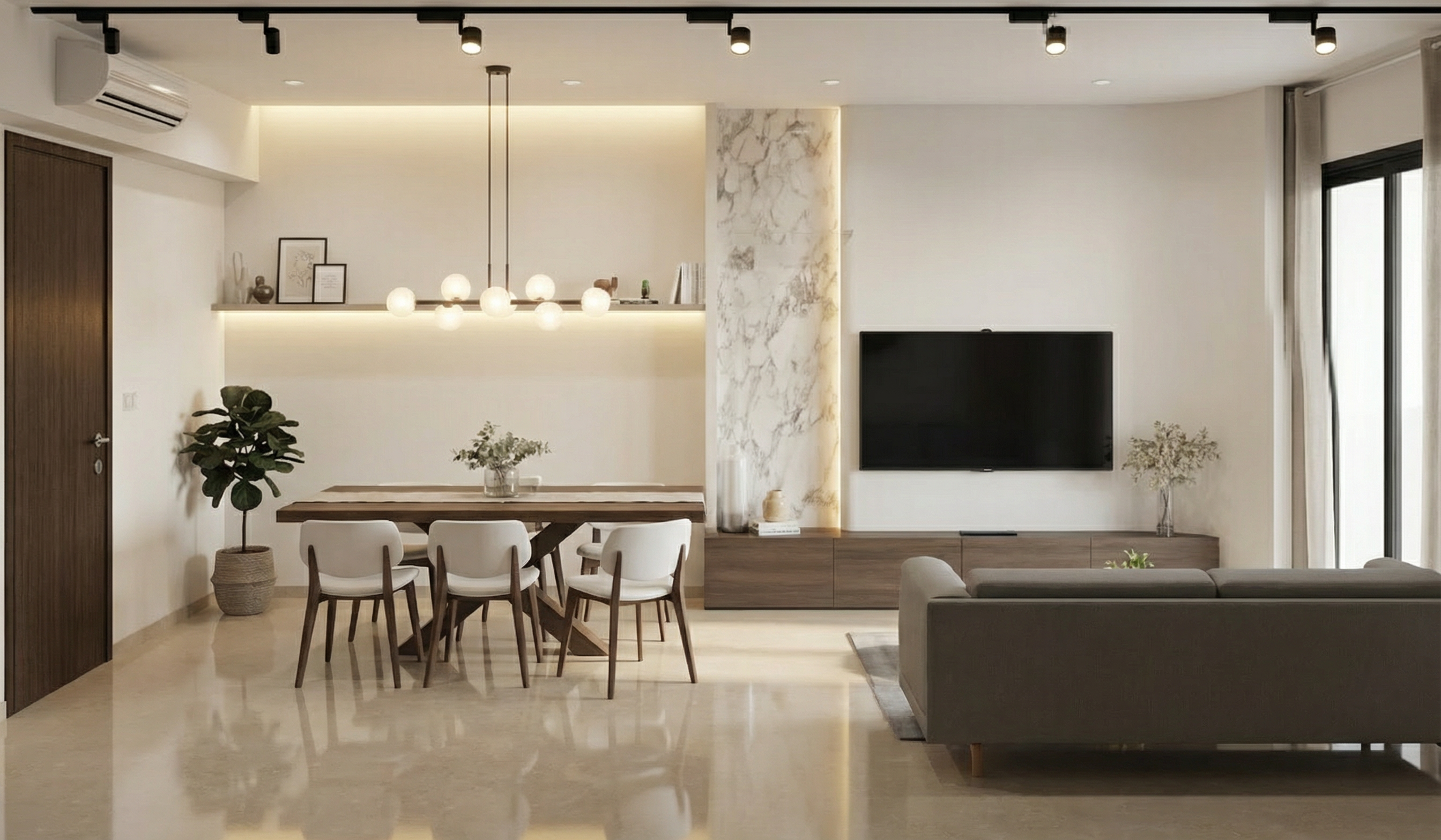 add modern sectional couch against left side casework facing the opposite wall that has a tv mounted on the casework add a luxurious silk rug add a modern lounge chair add end tables with table lamps add floor lamp next to armchair add books and accessories to open shelves