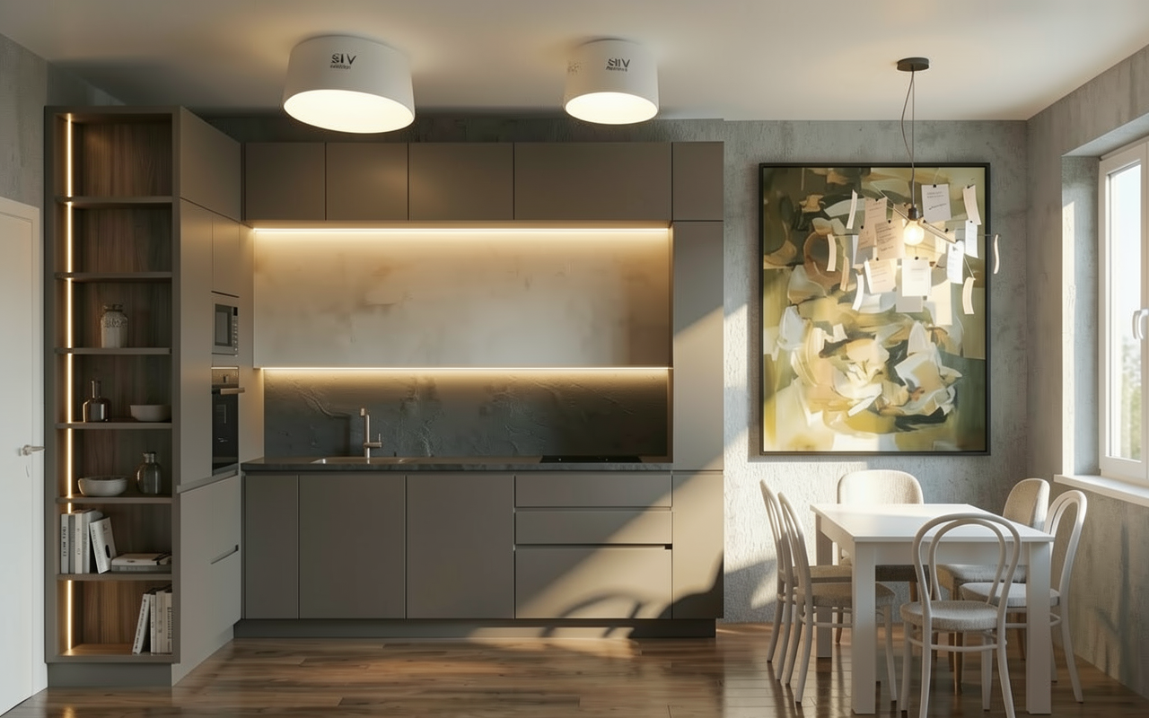cambia todo lo que aparece como revestimiento de madera por un gris liso todo lo dem s d jalo como est no toques el resto de paredes ni muebles ni encimera ni sillas ni nada solo las partes en madera