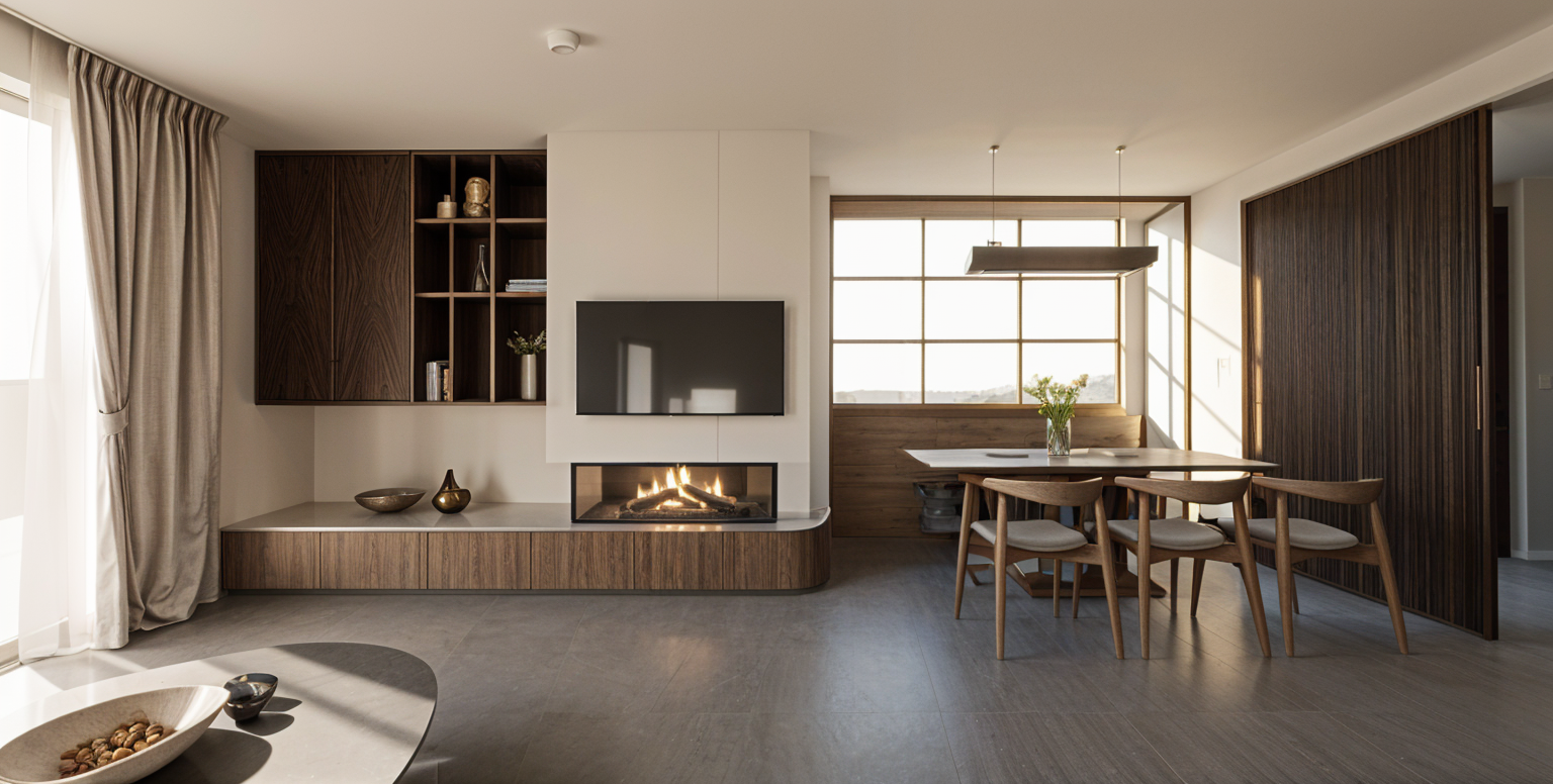 loose watercolor rendered elevation sketch dark grey horizontal siding brown vertical siding snowy pine forest around the home and distant low mountains alpine glow from behind the camera