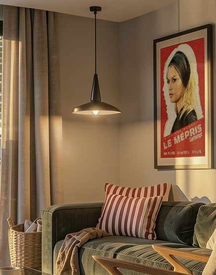photograph of a warm contemporary living room interior fixed slightly angled framing showing a green upholstered sofa beige curtains on the left with sunlight entering a black pendant lamp centered above the sofa a framed poster on the right wall and a wicker basket on the floor keep absolutely all original elements composition lighting colors shadows and textures exactly the same without modifying anything existing add only one element a monstera deliciosa plant placed behind the sofa positioned under the pendant lamp but slightly closer to the curtains than to the framed poster the plant must integrate naturally and realistically with large green slightly glossy leaves some leaves visible above the backrest of the sofa the plant should slightly exceed the height of the sofa cushion but not by much clearly remaining between the sofa and the lamp and not reaching the lamp s height the scale must be consistent with the space and the lighting must match the existing warm light respecting the current shadow direction and intensity the plant must not have a visible trunk or stem structure only leaves should be visible emerging directly and softly from below the sofa line with a dense clean decorative appearance modify only the sofa cushion it must become a single continuous cushion remove any duplication or separation with a natural folded appearance slightly creased as if softly bent while strictly preserving the original red and white striped pattern fabric color and texture photorealistic style high resolution seamless integration no artifacts no changes to the original scene beyond the specified edits