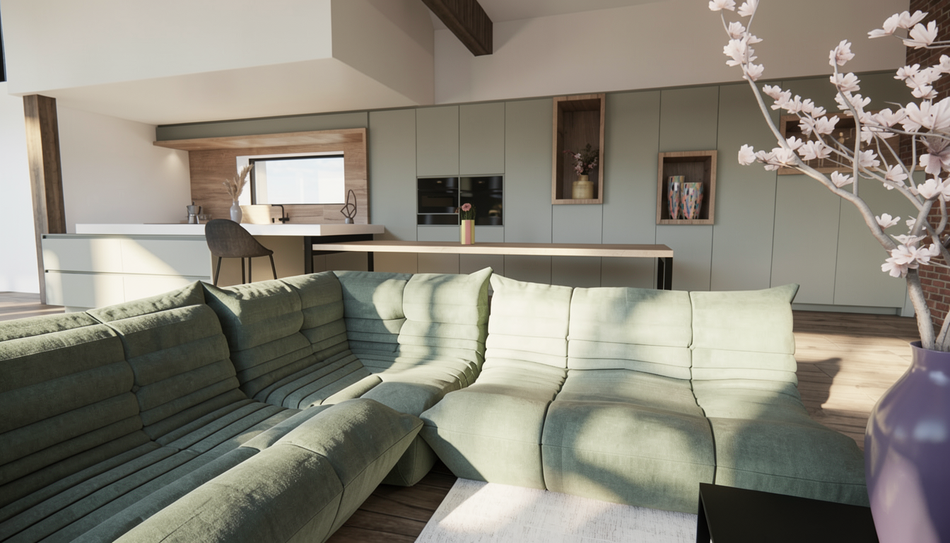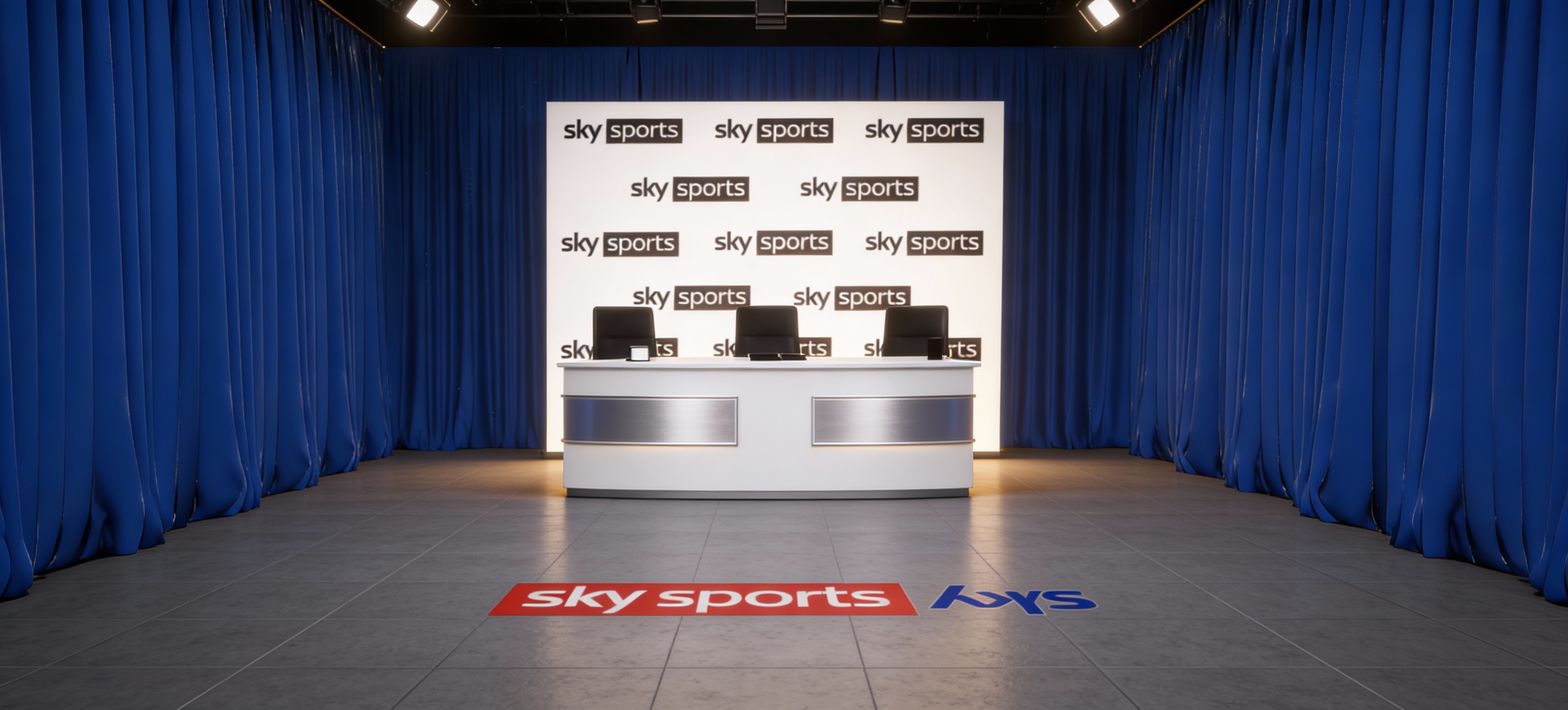 the space should be lit like a tv studio and not too organge remove all plants do not light the back screen too much make the floor a grey lino with some texture add two bands of silver to the desk rotate the sky sports logo that is on the ground and inside a red box 180 degrees but remain in the same place