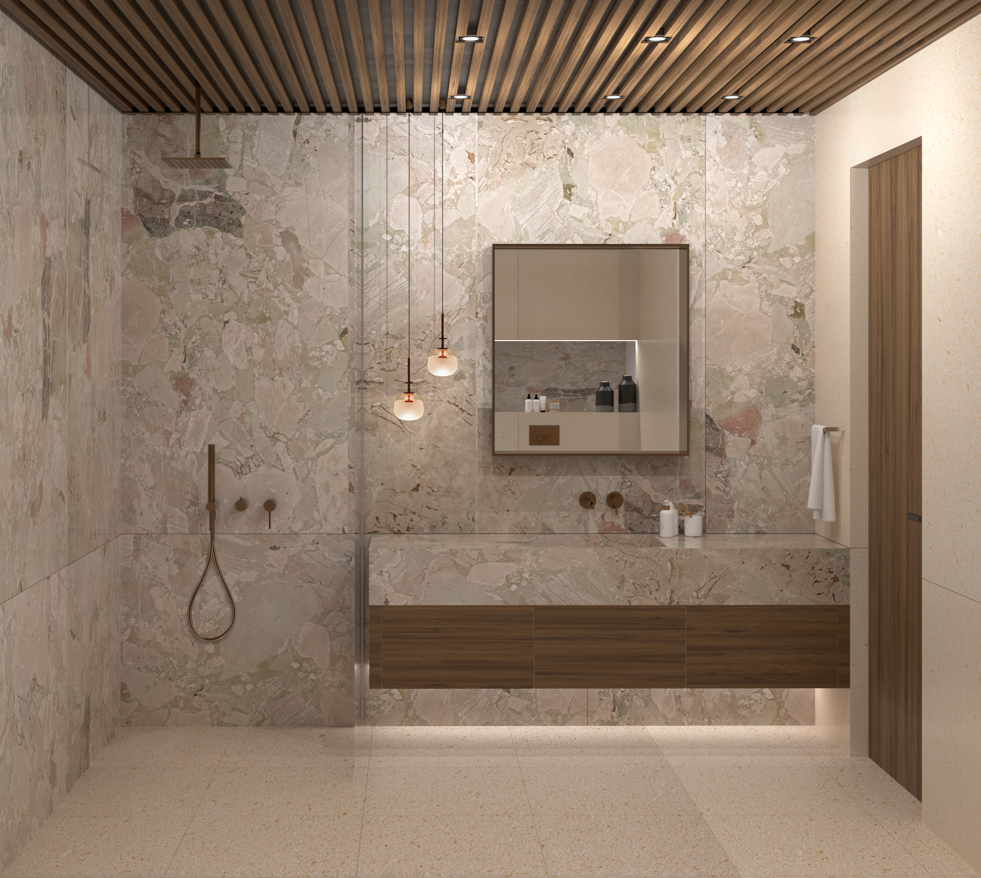 enhance this bathroom render by improving material realism micro details and surface definition while strictly preserving the original lighting setup do not change light intensity exposure color temperature shadow direction or add any new light sources the bathroom has no windows maintain the exact artificial lighting and enclosed atmosphere improve texture sharpness tiles grout marble veins metal fixtures glass ceramics refine reflections and roughness maps increase subtle contrast for depth and reduce noise keep the scene photorealistic balanced and natural without introducing daylight window light or global illumination changes