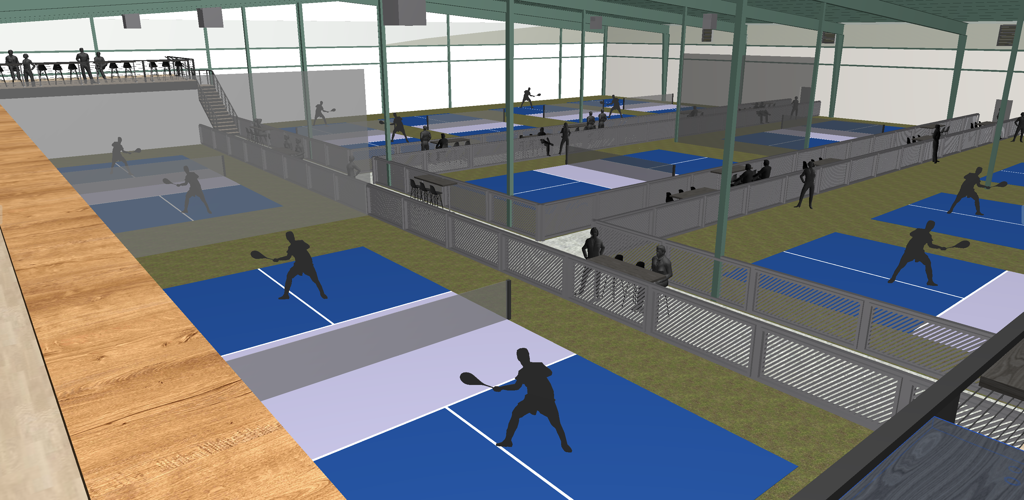 indoor pickleball facility with players and observers ambient light coming into the space through translucent clerestory