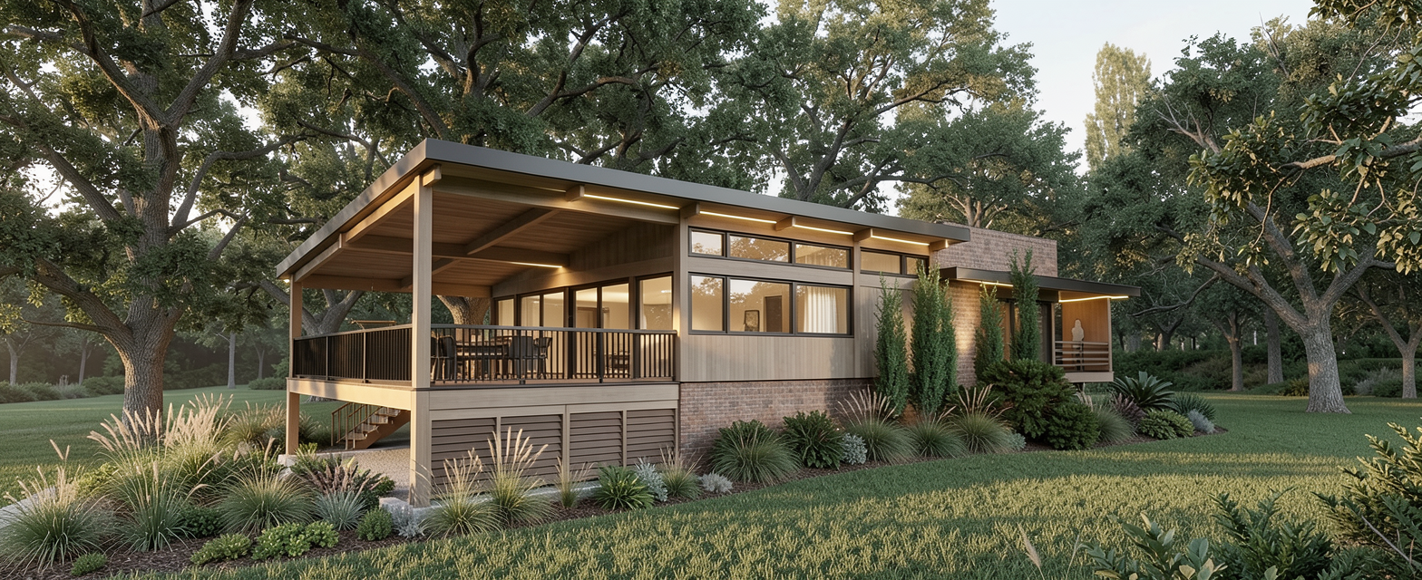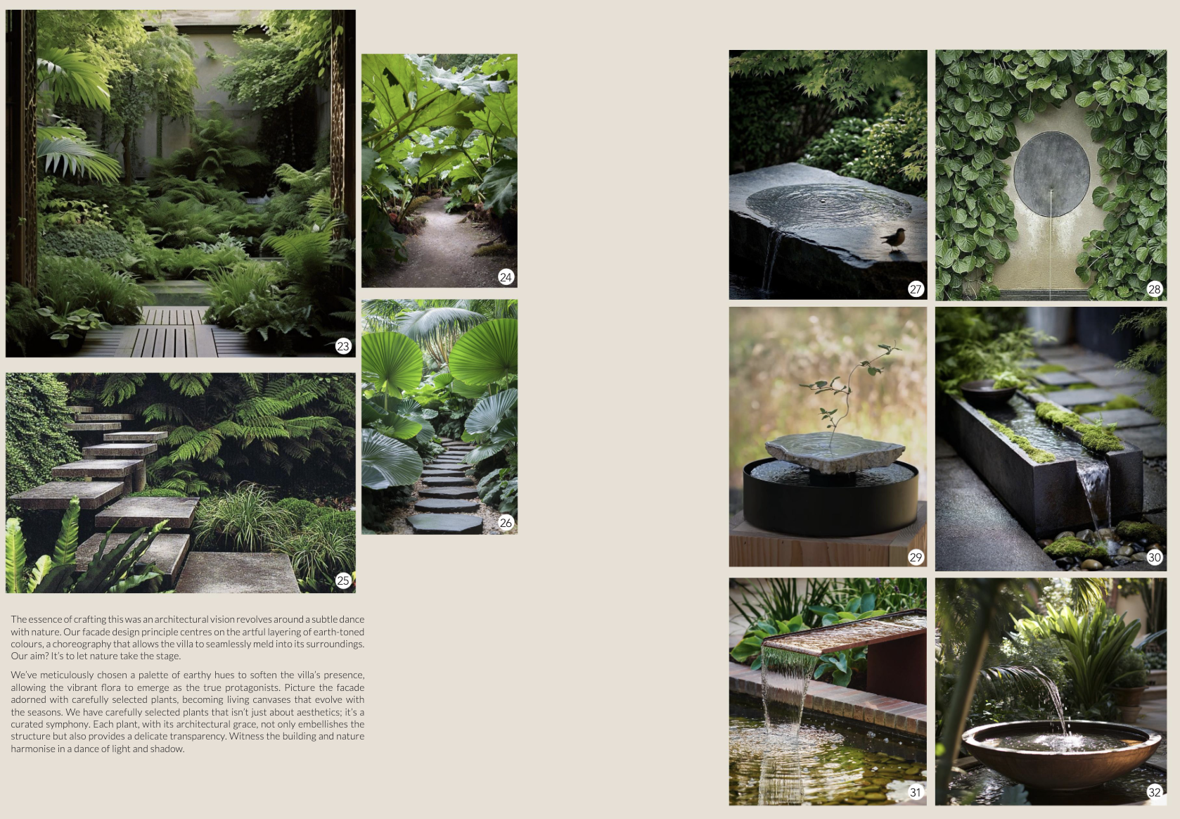 exterior shot apply the mood board vegetation to the area around the building a tropical japanese garden with balinese touch and morning lighting