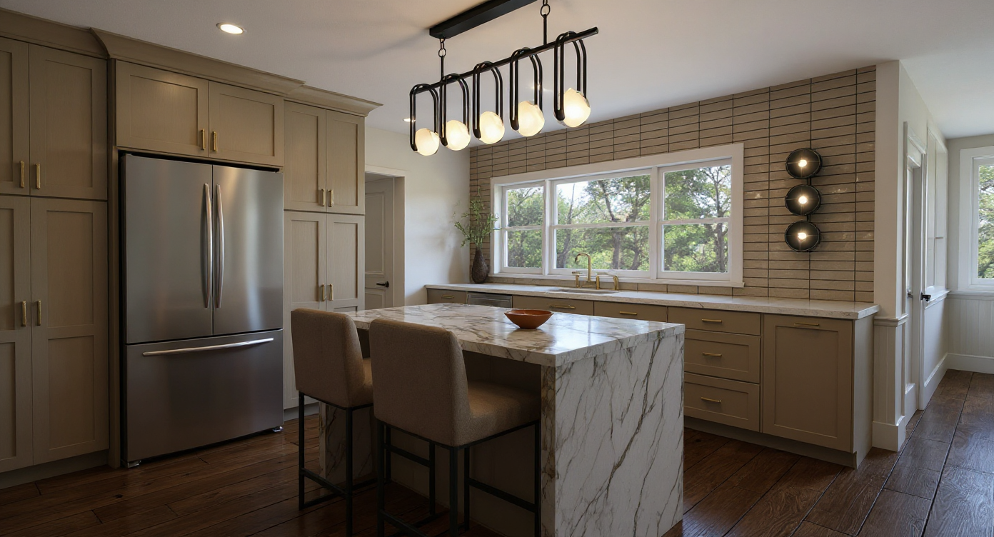 interior rendering instructions interior space featuring light colored wooden parquet flooring laid in a 45 degree herringbone pattern smooth elegant white walls with a refined minimalist finish a full height built in cabinet with niches and doors made of golden cypress melamine masisa with a warm and natural appearance the ceiling includes short linear track lighting each track fitted with two white spotlights providing soft controlled illumination the window glass should be clearly visible with subtle reflections exterior lighting is reduced to a soft morning light with gentle daylight filtering in and tree branches visible outside creating a calm and natural atmosphere