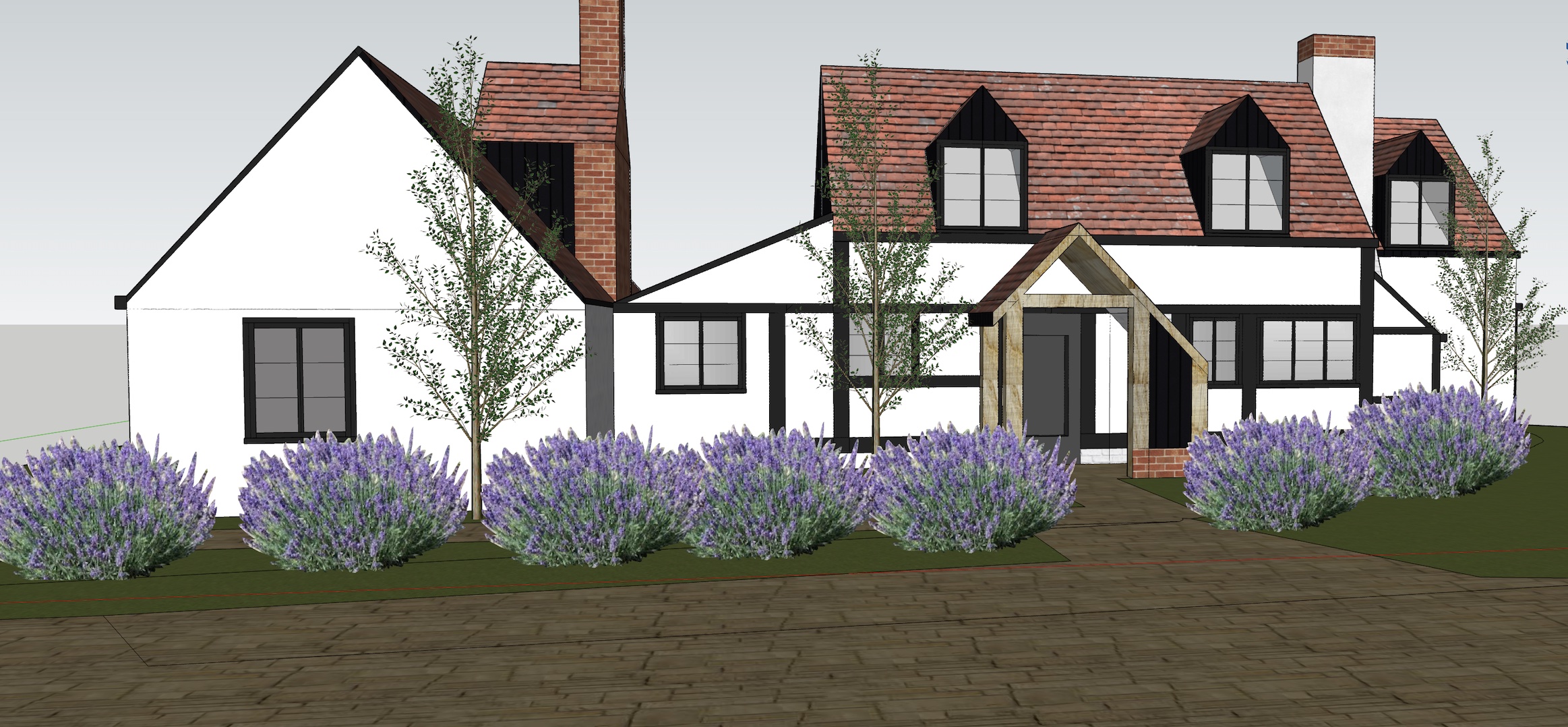 exterior shot 17th century tudor style oak frame english cottage in the countryside red clay tile roof white render gravel driveway
