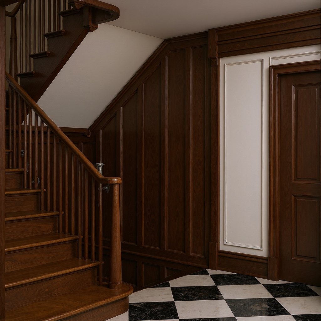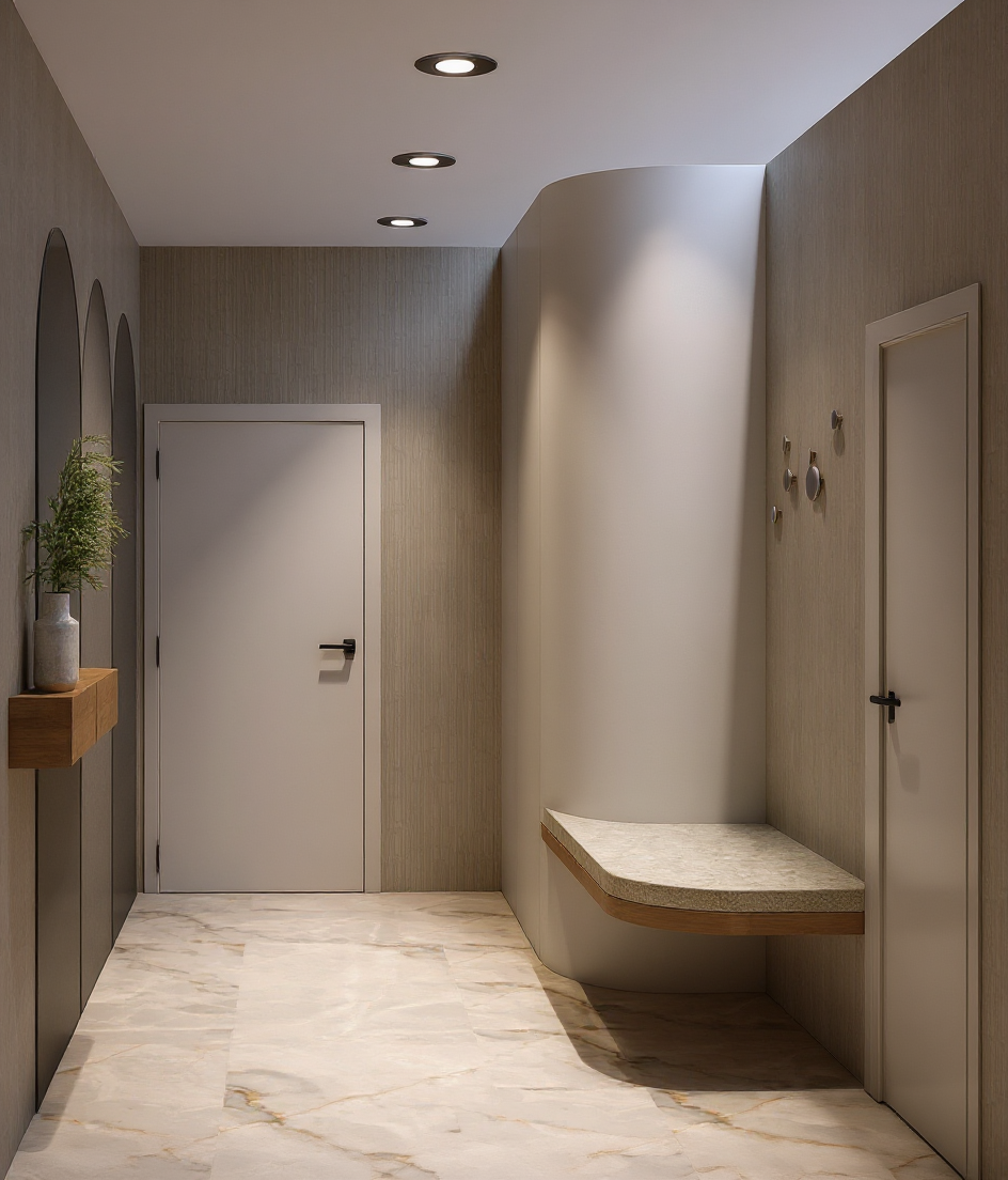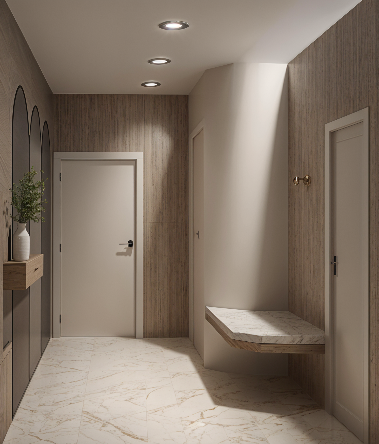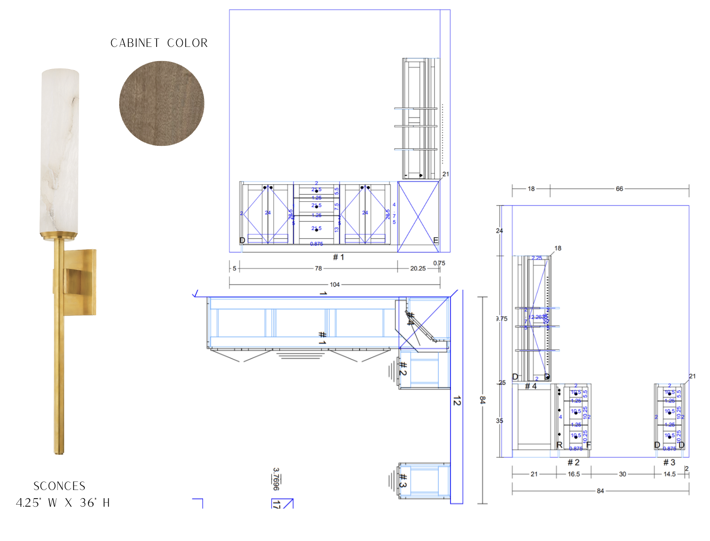 create a rendering of this bathroom plan for me the right side is a vanity and the left side is double sinks there are 3 sconces on the left with 2 mirrors there are 2 sconcs on the right with one mirror the cabients are a medium stain color clear alder and the mirros are black with brass acccent plumbing is brass no can you lay it out like the plan on the board