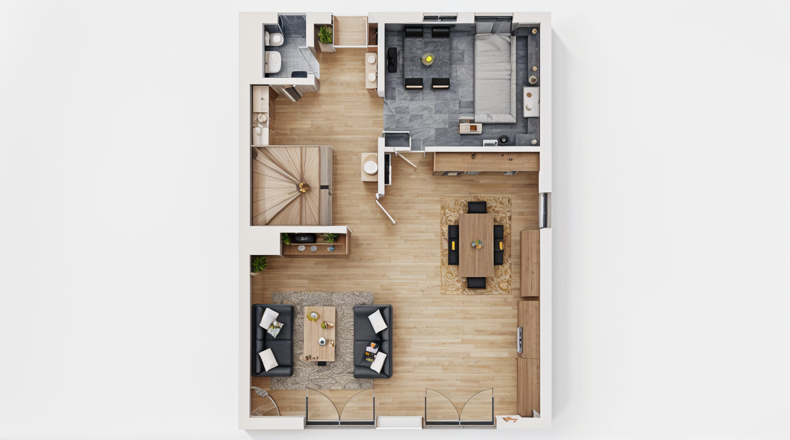 add minimal shrubs change the veranda roof to charcoal standing seam metal change main roof to black shingles add hills change siding to white add trees in the background