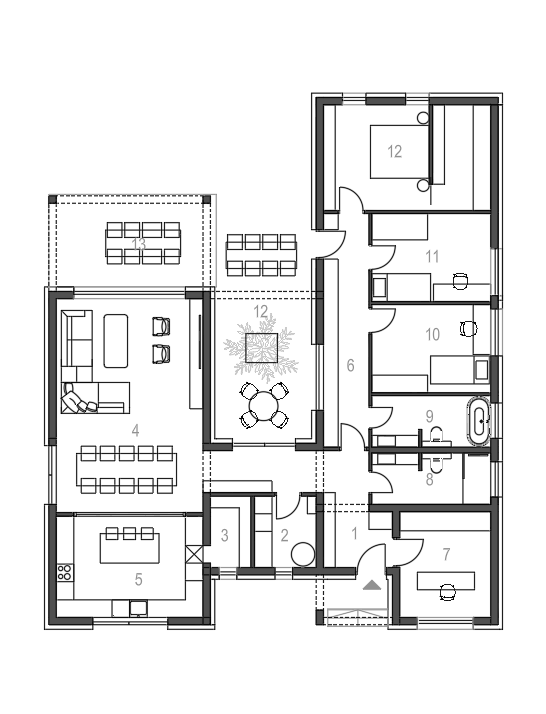 convert this floor plan into a realistic isometric 3d view of a full house show the space from an elevated angle with furniture walls and details visible make scandinavian home in parents room add walk in as in plan remove pergola use the same furniture as shows on the plan do not change the orientation of the floorplan