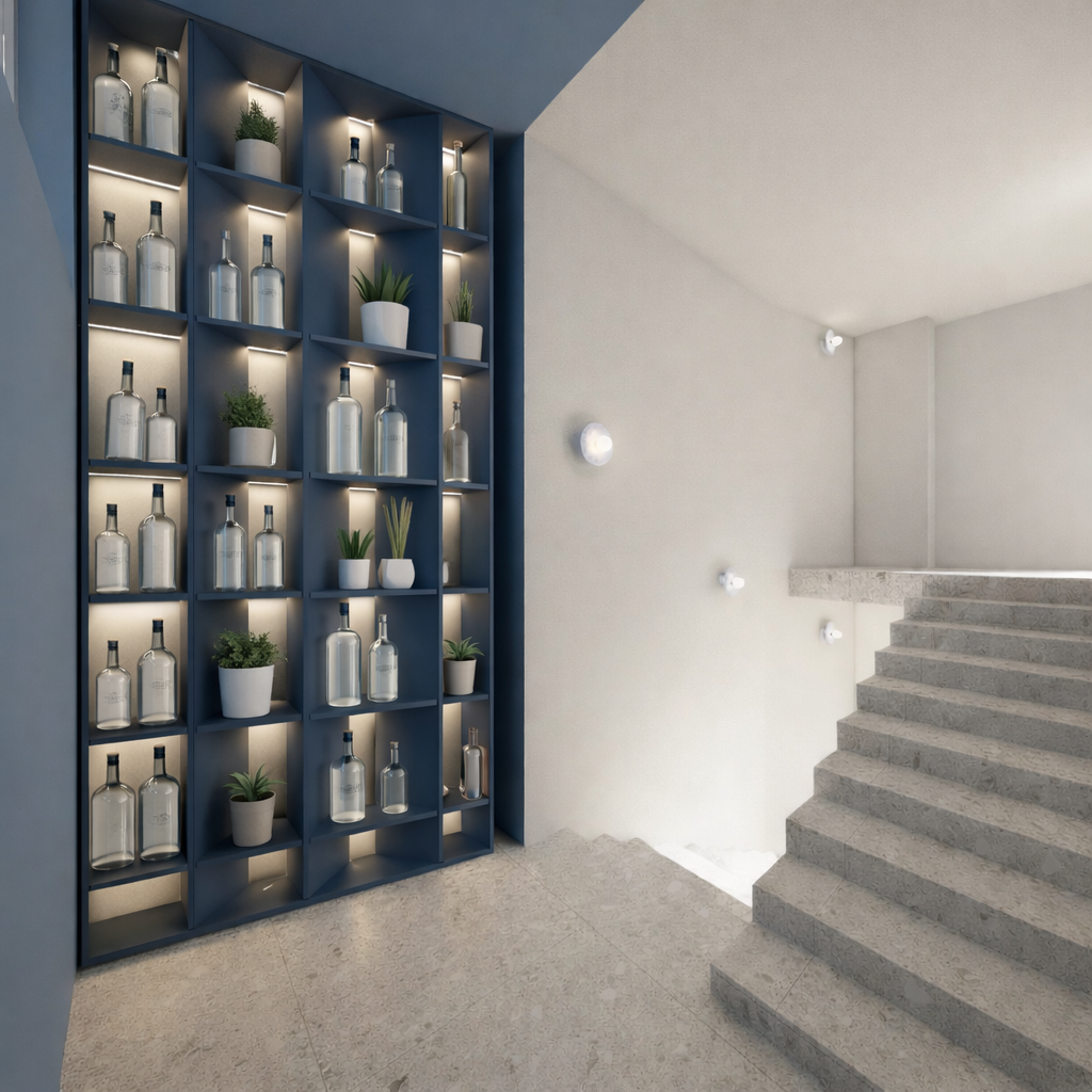 exterior shot add such railings to the stairs as in the reference after the last step they turn right to the wall