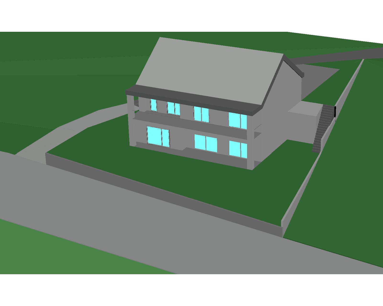 exterior shot white facade grass trees in the background no buildings more natural windows grey window frames summer vibe road below architecture