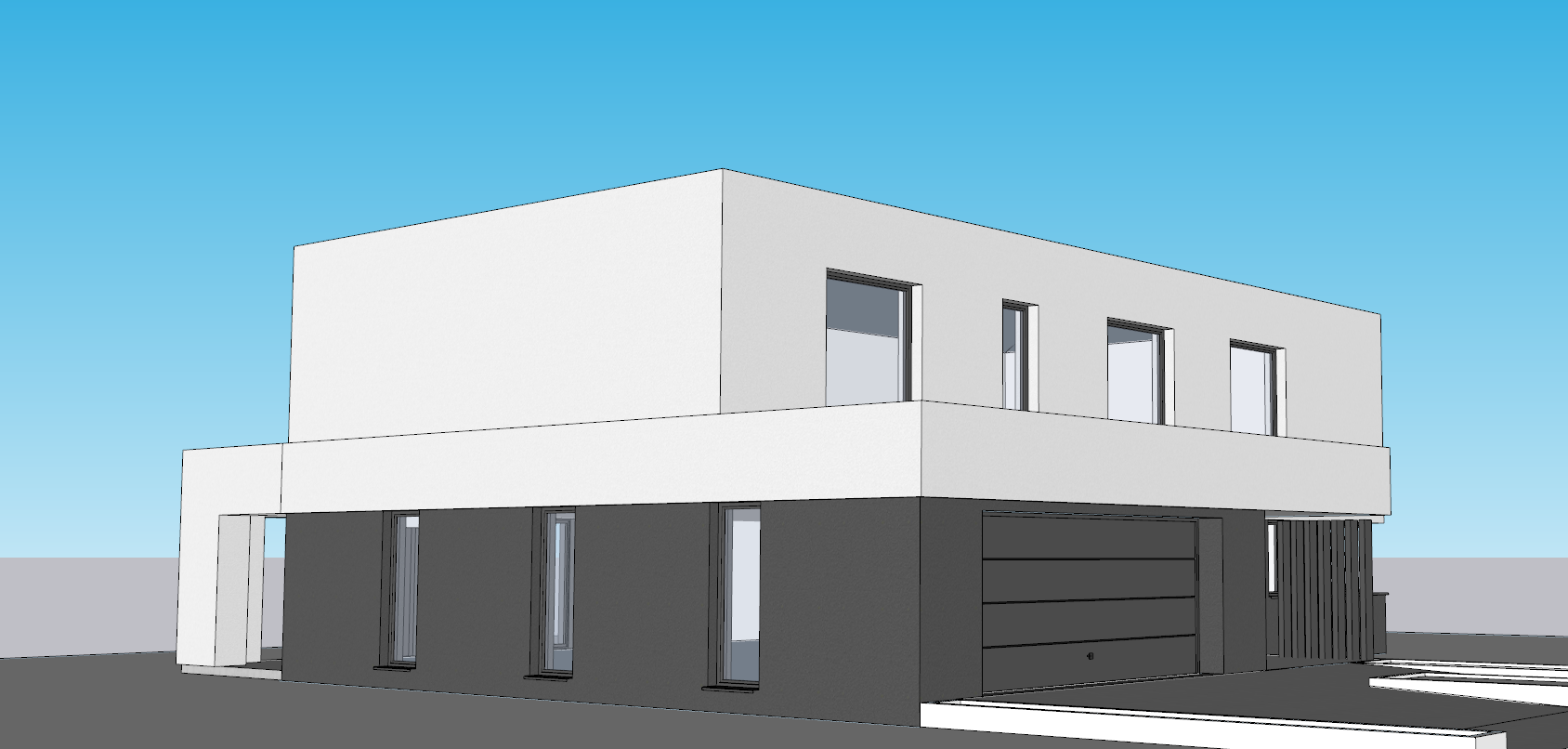 minimalism style white and dark gray plaster walls dark gray windows curtains in the windows photorealistic grass low size plants cement pavement leading to entrance and gate