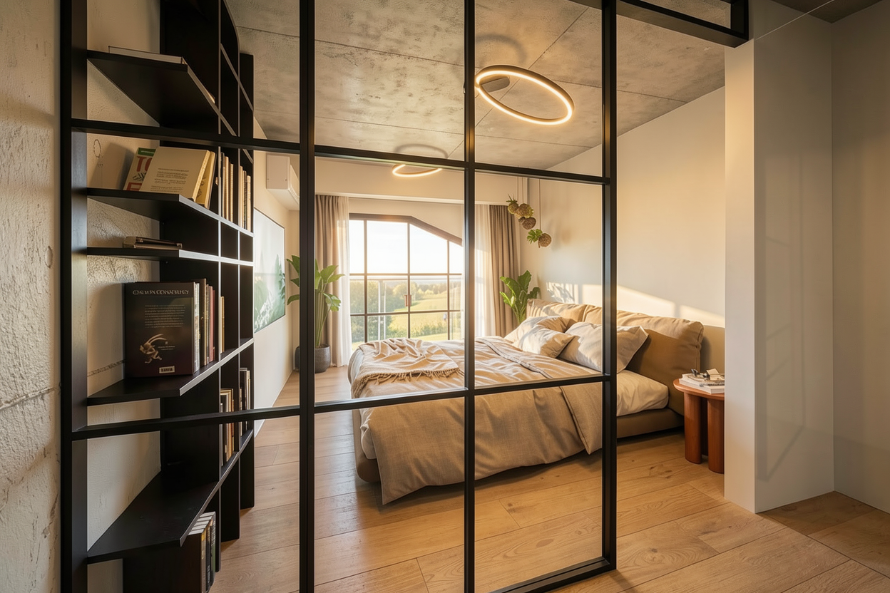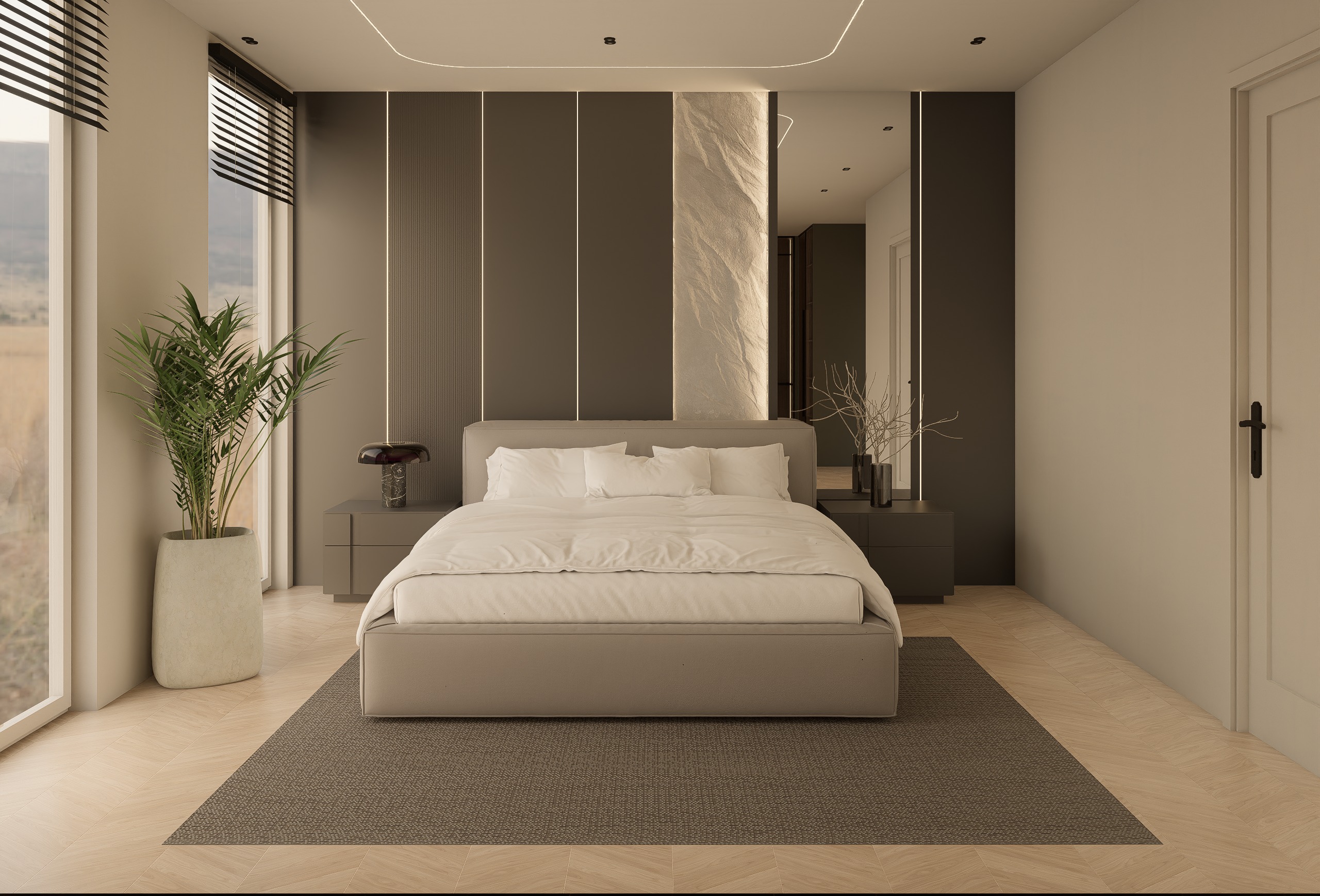 create an ultra photorealistic luxury bedroom render from this exact camera angle keep the exact original design layout proportions bed shape headboard wall composition nightstands mirror position decorative objects plant position door location window size blinds ceiling lighting lines rug placement and floor pattern unchanged do not redesign or move anything the goal is to transform this render into a real photo quality interior visualization with highly believable materials lighting and depth make the render look fully real with physically accurate lighting soft natural daylight entering from the left side windows warm ambient interior lighting realistic global illumination soft bounce light contact shadows and natural shadow gradients premium interior photography mood with subtle cinematic contrast refined highlights and realistic lens feel calm elegant high end atmosphere analyze and enhance the materials so they feel truly physical and realistic bed and upholstery upholstered bed frame in warm taupe beige fabric realistic woven textile texture with subtle fibers and soft rounded edges bedding should look premium and natural in warm white or ivory cotton or linen add realistic duvet loft soft wrinkles natural folds layered pillows and believable tension in the fabric make the bedding feel plush luxurious and lived in but still clean and refined headboard wall dark large wall panels should feel like matte lacquer or premium dark veneer with subtle reflectance and real depth vertical textured panel section should read as fine ribbed wood or fluted paneling with soft linear shadowing light stone or plaster textured feature strip in the center should look truly natural with rough mineral depth subtle irregularity and realistic side lighting integrated vertical led lines should glow softly and realistically without overexposure nightstands and decor dark bedside tables should have a smooth premium matte lacquer finish with realistic edge highlights left lamp should have realistic glossy smoked glass or polished dark finish with proper reflections right side vases and branches should look physical and refined floor and rug light oak herringbone floor with authentic wood grain natural tonal variation and realistic plank definition rug should feel like a dark woven textile with visible fabric structure and soft thickness plant and pot large plant should look natural healthy and realistic with proper leaf variation planter should have a realistic matte stone or plaster texture add elegant curtains at the windows full height sheer curtains in soft warm white ivory or light beige realistic soft folds from ceiling to floor lightweight premium fabric with natural transparency integrate them naturally with the existing blinds curtains must soften the daylight and make the scene more luxurious without changing the window design overall mood ultra realistic warm luxurious calm minimal refined editorial real photo quality interior render negative instructions do not change the design do not move furniture do not alter the headboard composition do not change materials into different colors do not redesign the ceiling or lighting lines do not change the floor pattern do not remove the blinds do not add extra furniture only improve realism material quality bedding realism and add elegant curtains add this final line too keep the exact original composition untouched only enhance material realism lighting realism bedding detail and add soft elegant sheer curtains at the windows