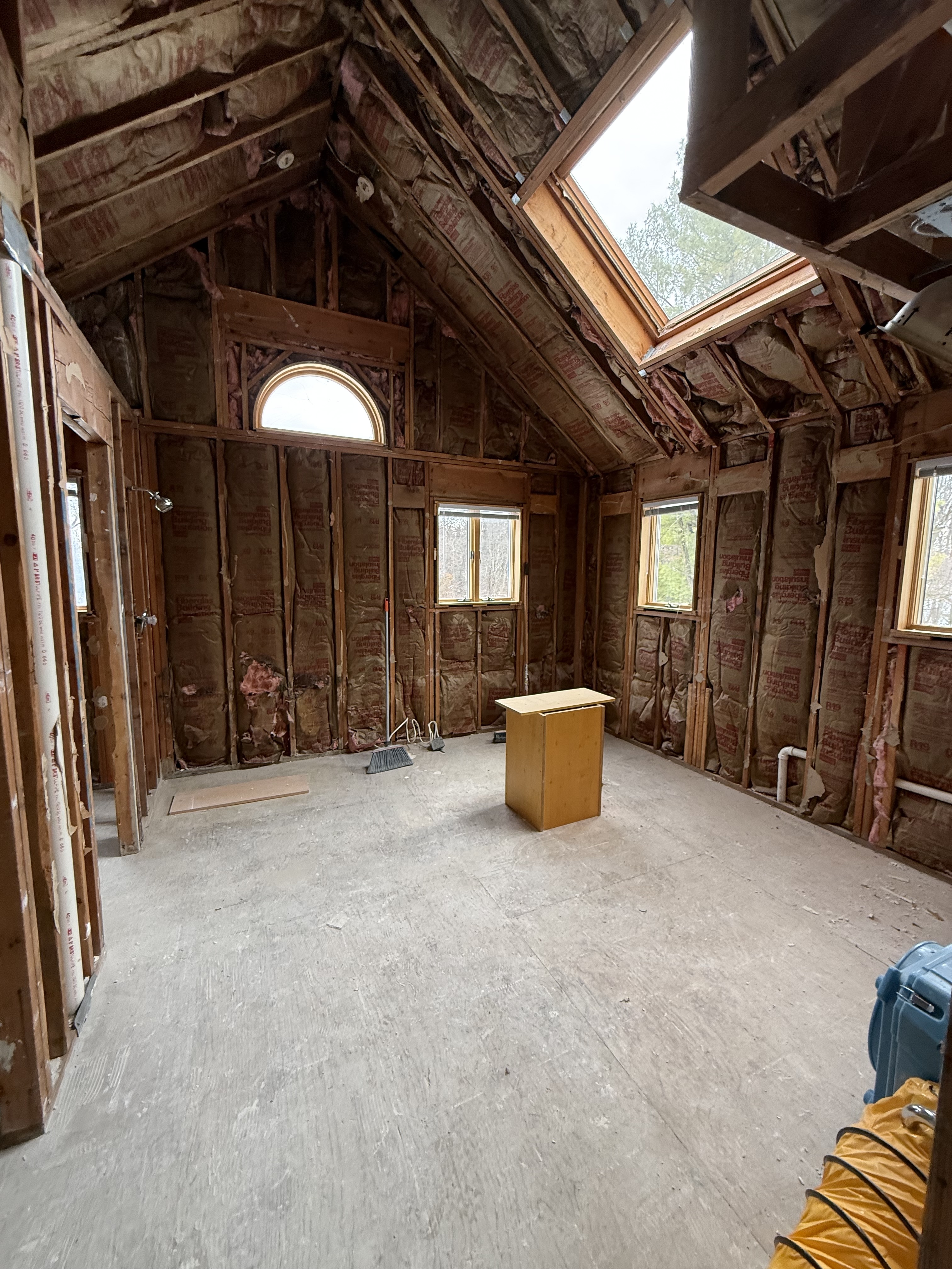 fill the floor with white marble tiles add a floating vanity to the left a standalone tub to the back right and a steam shower to the front right the walls should be a medium blue tile all the way up the ceilings should be painted white