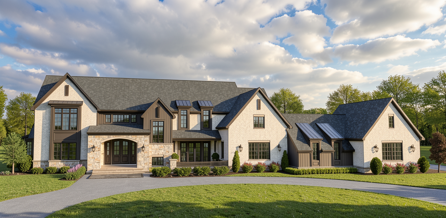 a beautiful rendering of a countryside house with a modern extension the house is made of rustic stone with a red brown tiled roof the modern glass extension has a sleek transparent design white painted steel post and cantilevered beams support a natural cedar sun louvred canopy extending over the courtyard the garden is lush and green with neatly cut grass and scattered trees use warm beige tones for the stone and vibrant green for the grass and foliage the sky has light clouds with soft shades of blue and white creating a serene peaceful atmosphere