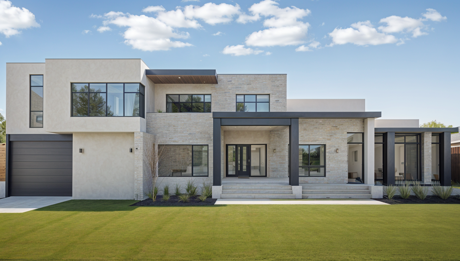 exterior shot a modern minimalist house design with a flat roof featuring a beige facade and large dark framed windows the right section has natural stone cladding a row of columns supports an extended roof casting soft shadows on the entrance greenery is neatly trimmed along the base and on the veranda adding vibrancy the atmosphere is serene under a clear gradient sky transitioning from light blue to pale pink the foreground is lush with bright green grass evoking a warm sunny morning