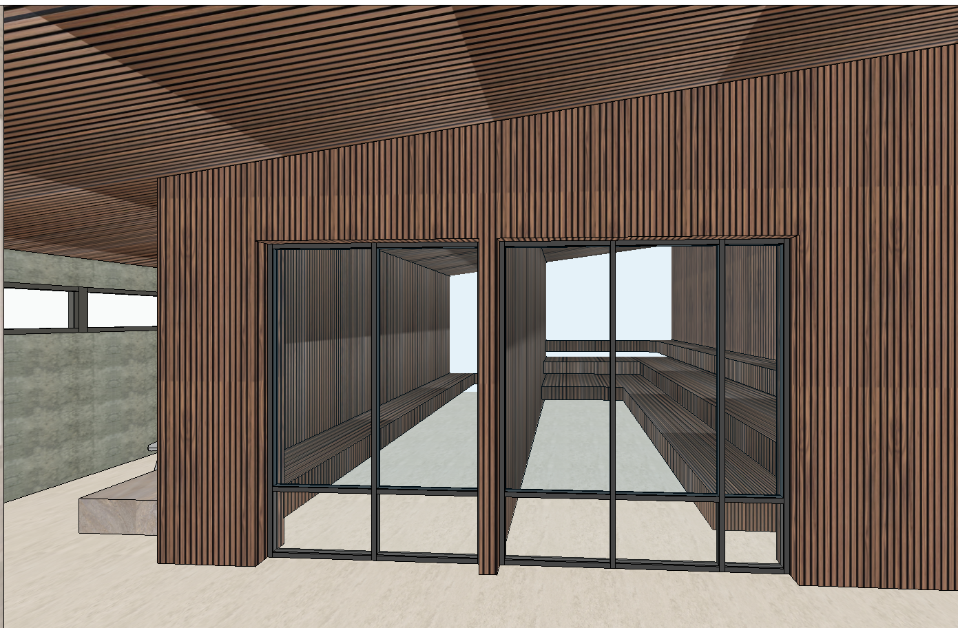 lighter wood slats inside sauna lights under the seats light grey tiles on floor