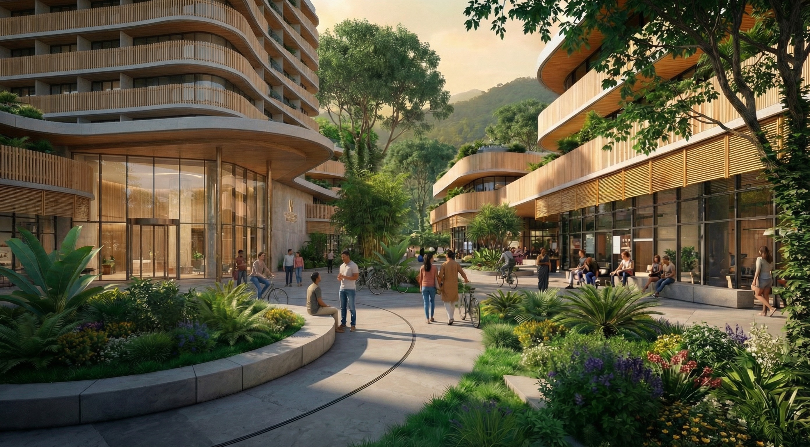 photorealistic architectural render based strictly on the provided image now extend the canvas upward so the entire building fits within the frame eliminate tall trees in background leave mountain trees