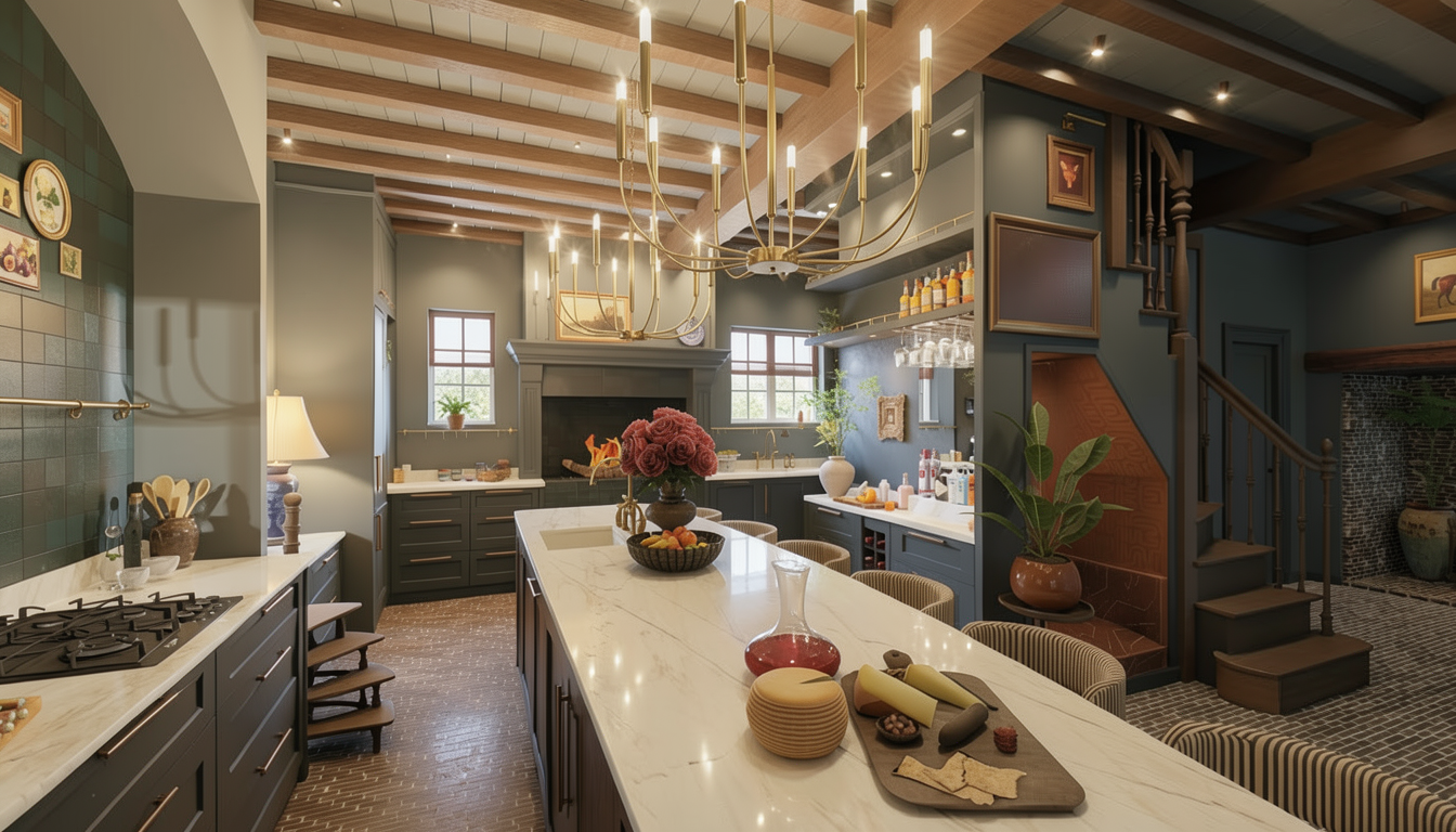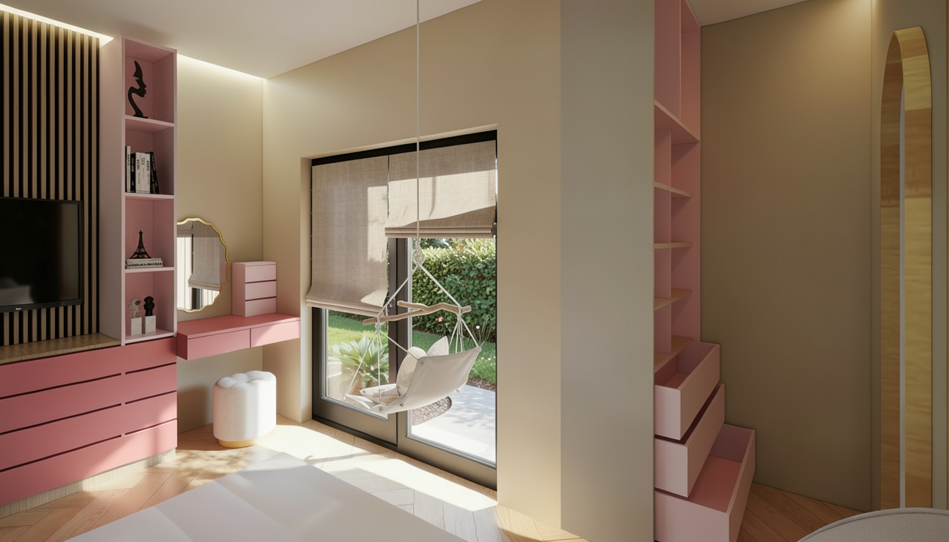 just a slightly more realistic rendering with natural daylight and interior lighting the ceiling is a concrete ceiling leave everything else and all the colours as they are
