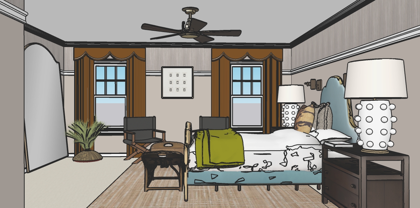 bed has a gold metal frame around the blue fabric the nightstands are a dark brown wood the floor is a off white carpet the lamp shades are pleated add brightness to the ceiling light and the wall sconces the curtains are a cognac color the rug is a very subtle rust orange modern pattern the bench at the end of the bed is bamboo with a woven seat the wall sconces are an antique brass and the crown and trim work is white the top portion of the wall is a neutral grasscloth wallpaper and the bottom part is a paint color that matches the wallpaper the ceiling fan is brass with walnut color wood blades the bed doesn t have any lines or boxes on the footboard the knobs on the nightstands are brass