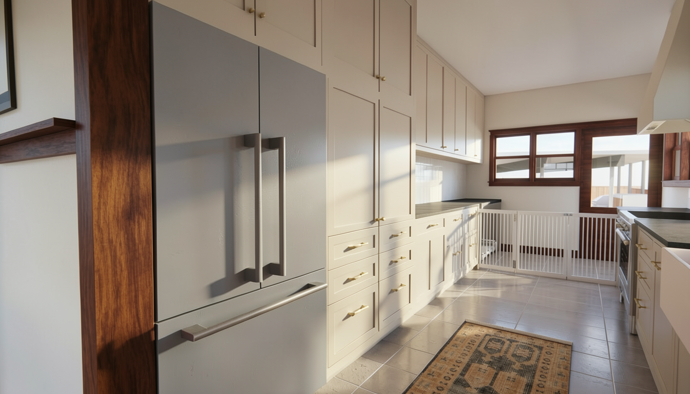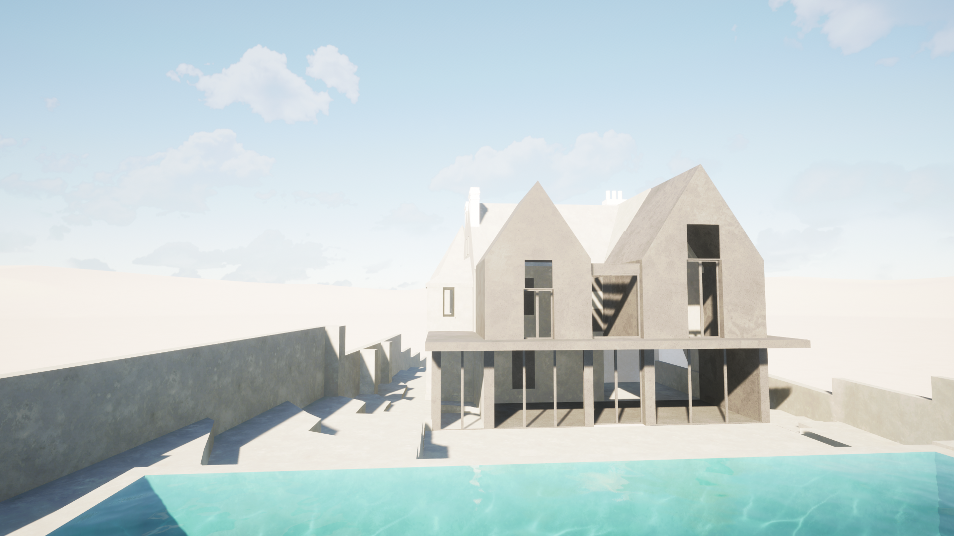 modernist exterior shot can you make this photorealistic with a pale warm silver timber cladding sitting over a darker stone ground floor level with a realistic swimming pool in the foreground and a view out over padstow bay in the background architecture