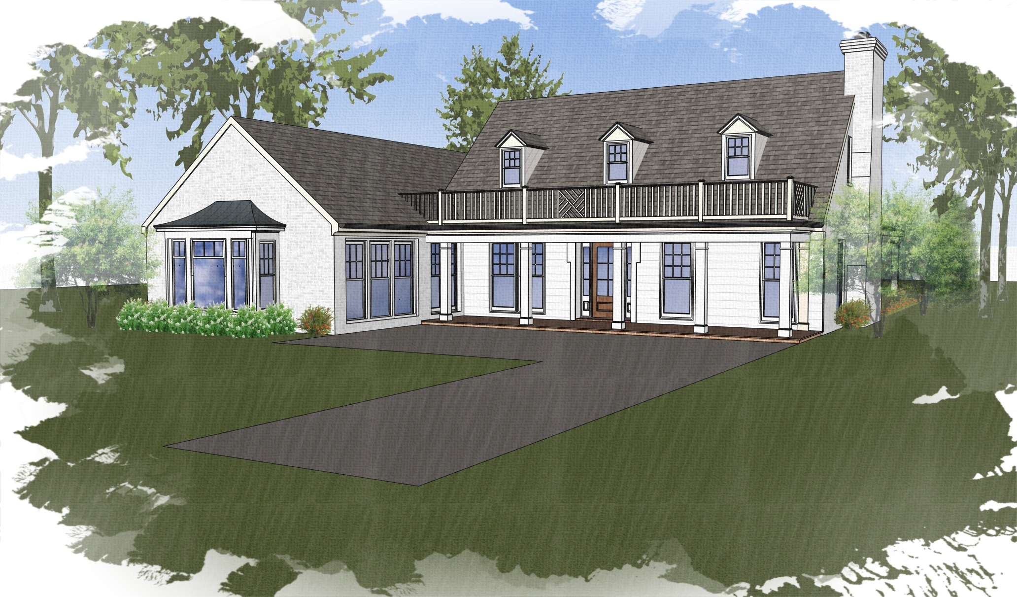 render to make look realistic white painted brick with white trim and overall cottage aesthetic warm soft lighting