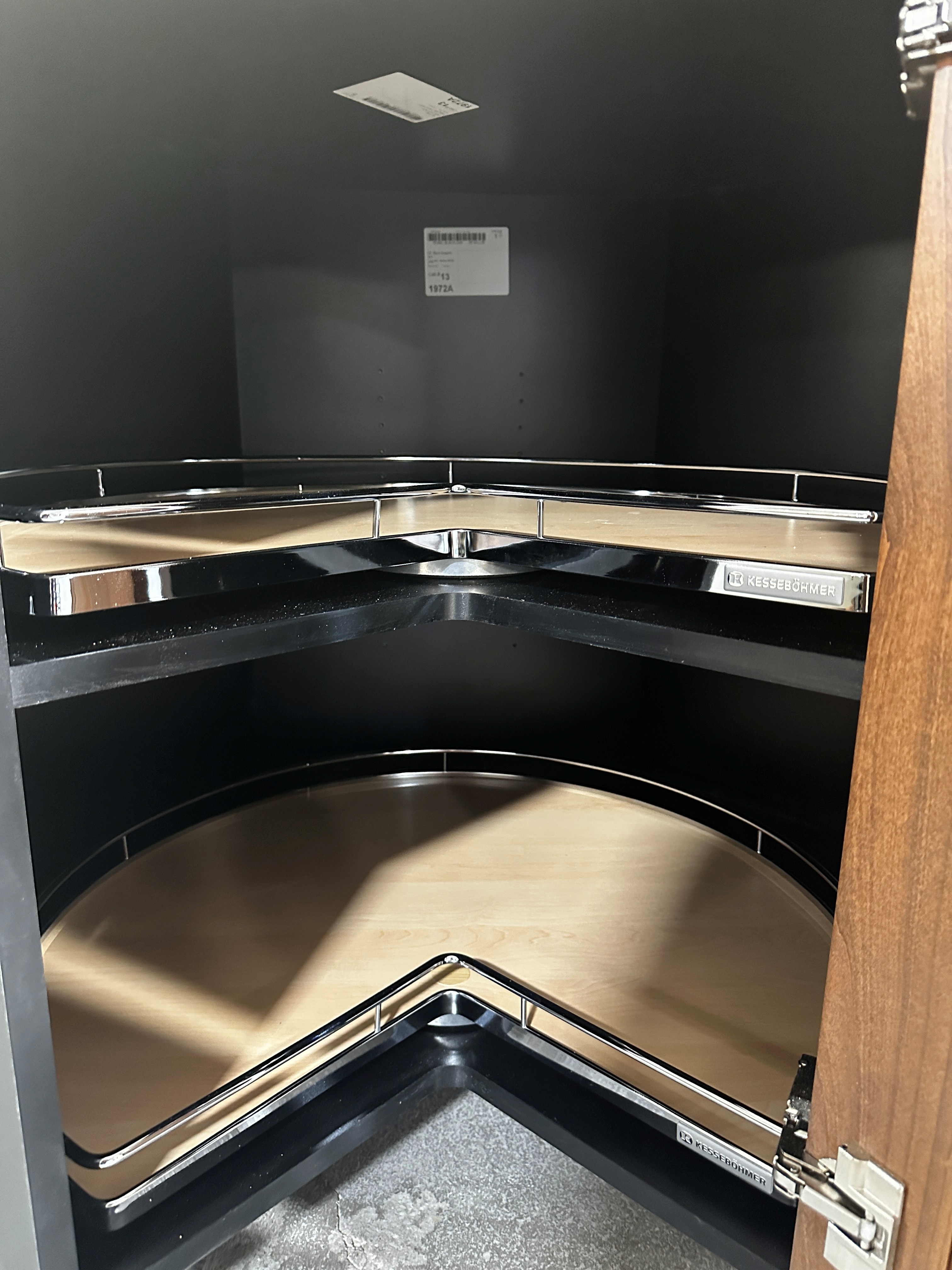add wood flooring remove the white stickers stage the shelf trays with small kitchen appliances and mixing bowls