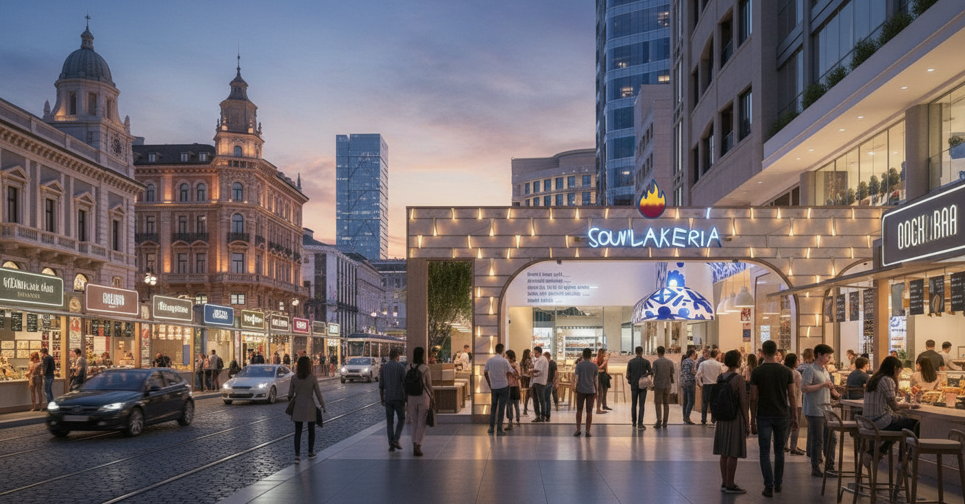 place in milan down town it next to other food pop up stores along a large commercial and street fooding street on the side of the street along the road or the sidewalk like all the other stores the view should be perspective add more people clients in the store