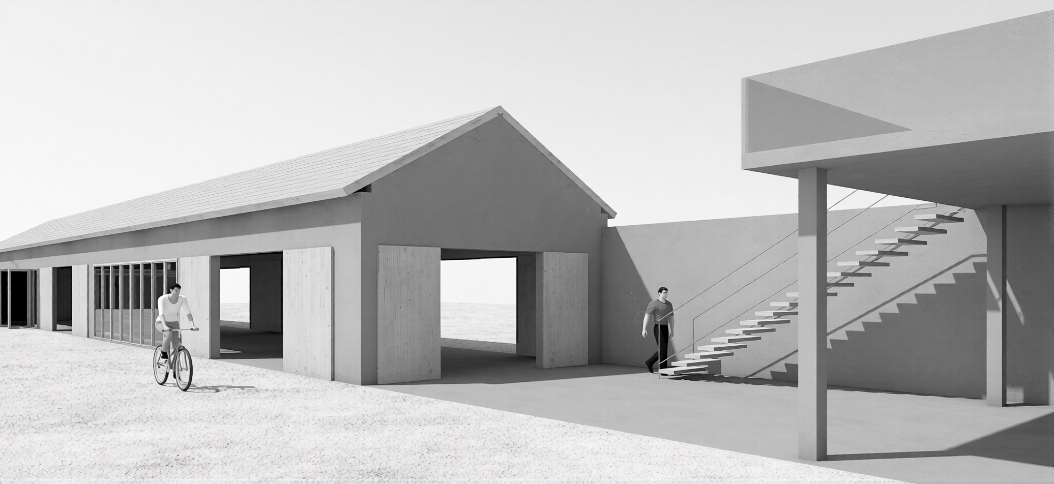 render a modern architectural scene with a minimalist building featuring a pitched roof the structure should be in smooth concrete with natural wood accents the sky is bright blue casting soft shadows on the ground include a person leisurely riding a bike wearing a casual outfit in light blue and white another person stands on a sleek staircase wearing a red shirt and black pants the atmosphere is calm and serene under a vibrant afternoon sun with gentle sunlight creating an inviting ambiance