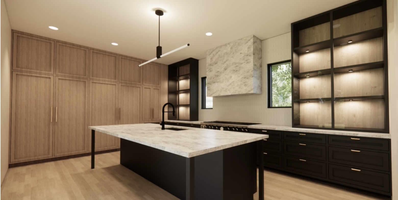 international style interior shot create a high quality hyper realistic image of a luxury kitchen from the attached rendering suitable for real estate marketing photos lighting atmosphere use soft natural daylight entering from the window to brighten the space maintain all exact materials finishes and architectural layout without substitutions or changes do not change the size of all the elements in the picture architecture