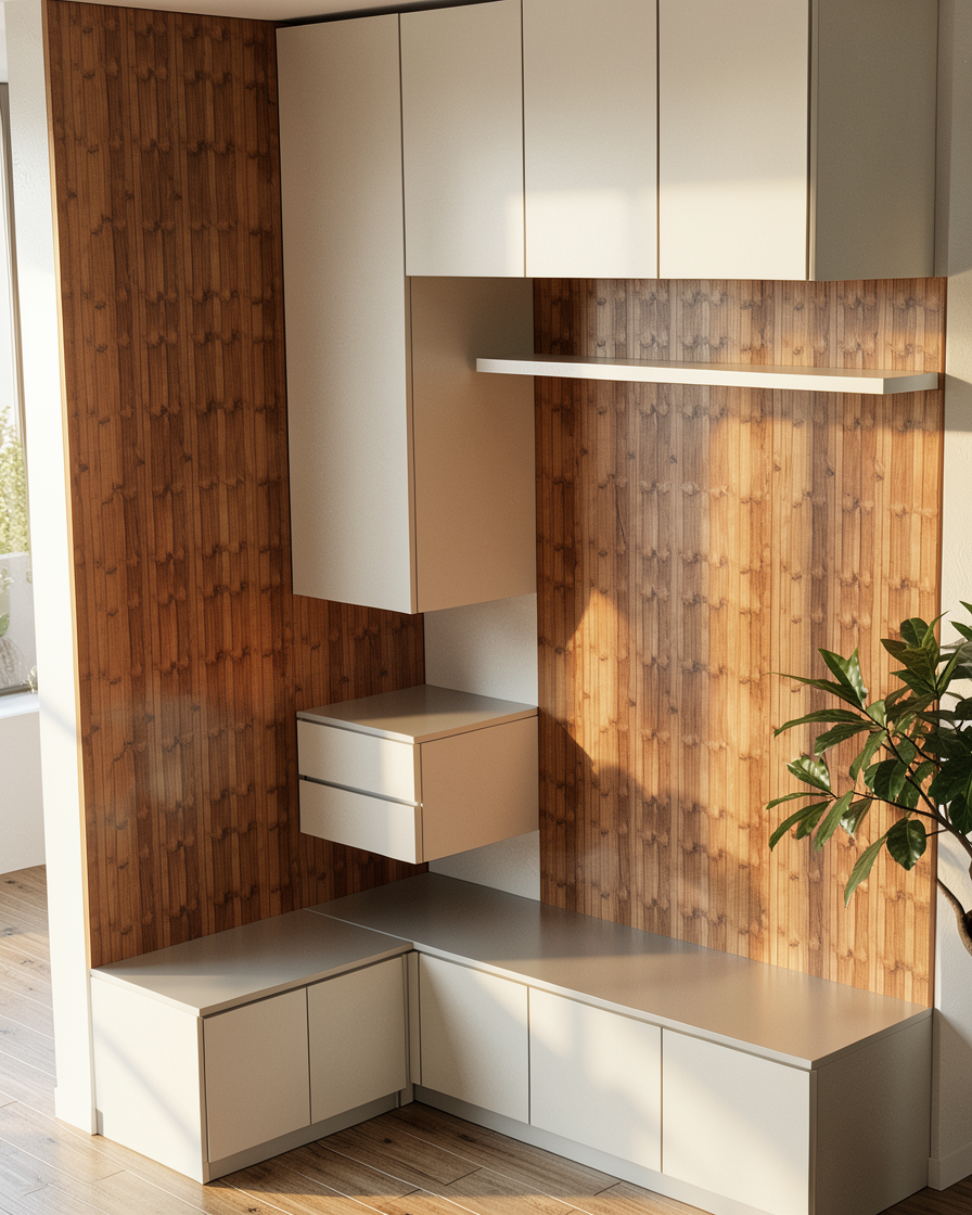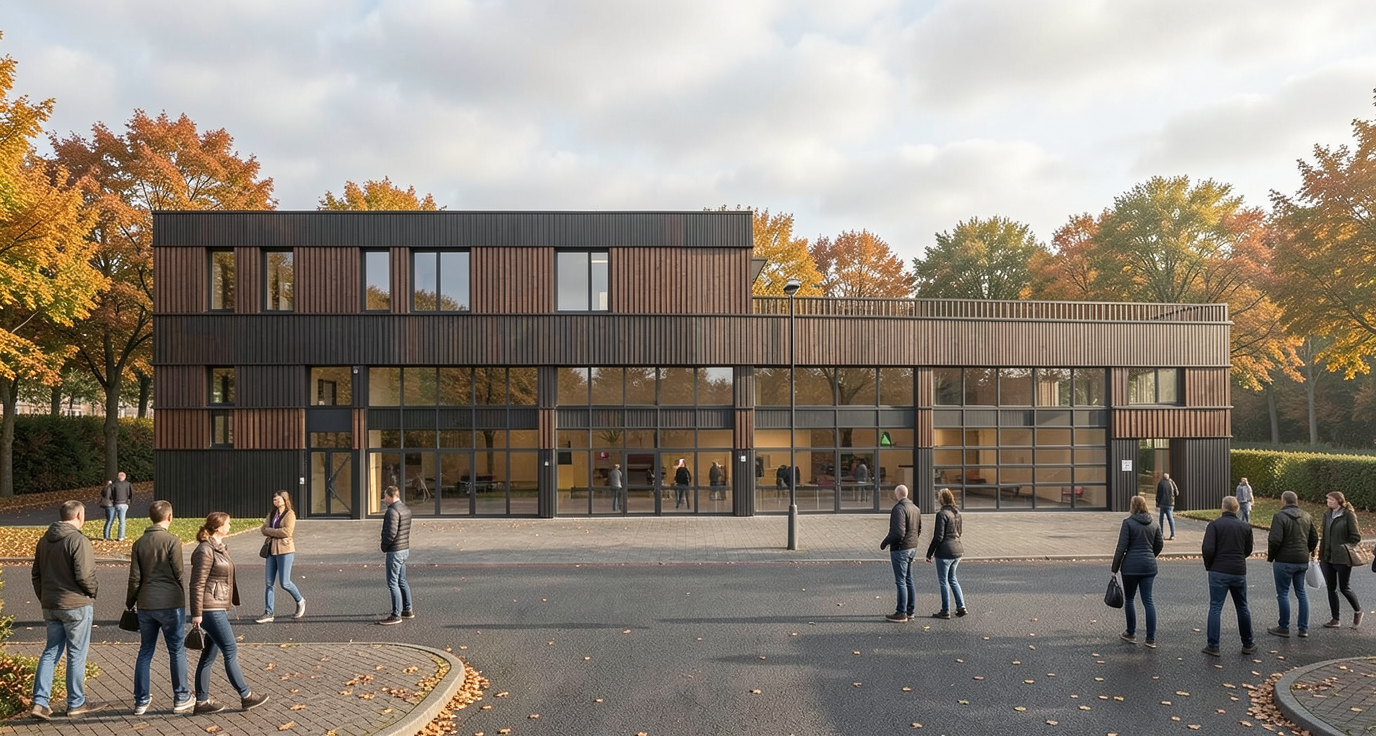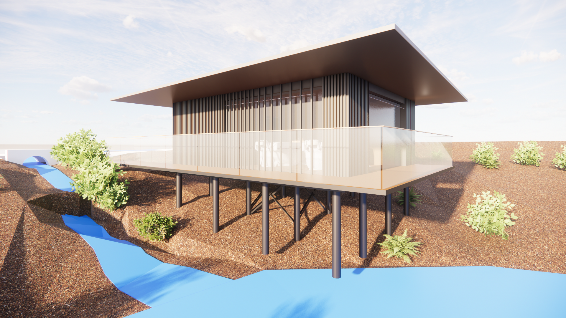 this is a house on top of small pond with small trees in the background the wall material is black burned wood please make it realistic and leave the landscape as it is the ground is dark brown with lush deciduous plants add darmera peltate plants under the house and around waterleave the original structureopenings are in dark black