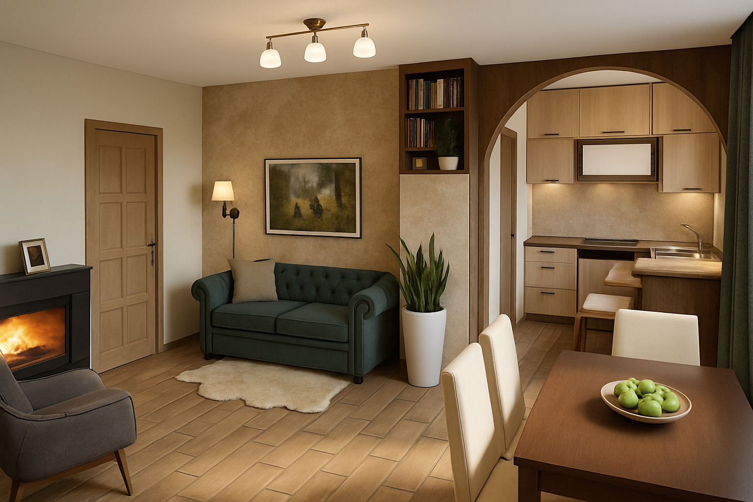 in the kitchen above the stove change that framed piece of furniture into a small window add a sky and a tree behind it there is no door on the left wall of the kitchen just make an opening there