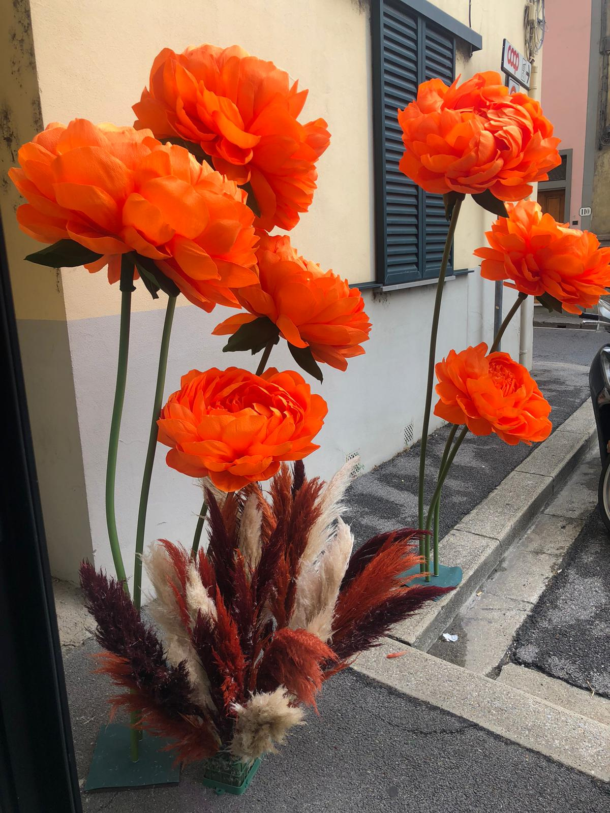 scontorna i fiori e disponili un po nei colori originali e un po con qualche corolla nera e arancione intorno ad un castello diroccato in atmosfera cupa stile famiglia adams stile halloween all imbrunire con qualche pipistrello che vola intorno qualche zucca arancione intagliata come quelle di halloween che giacciono nel campo davanti al castello assieme a qualche croce di tomba dissestata qualche cero acceso e un fulmine che colpisce la torre diroccata del castello