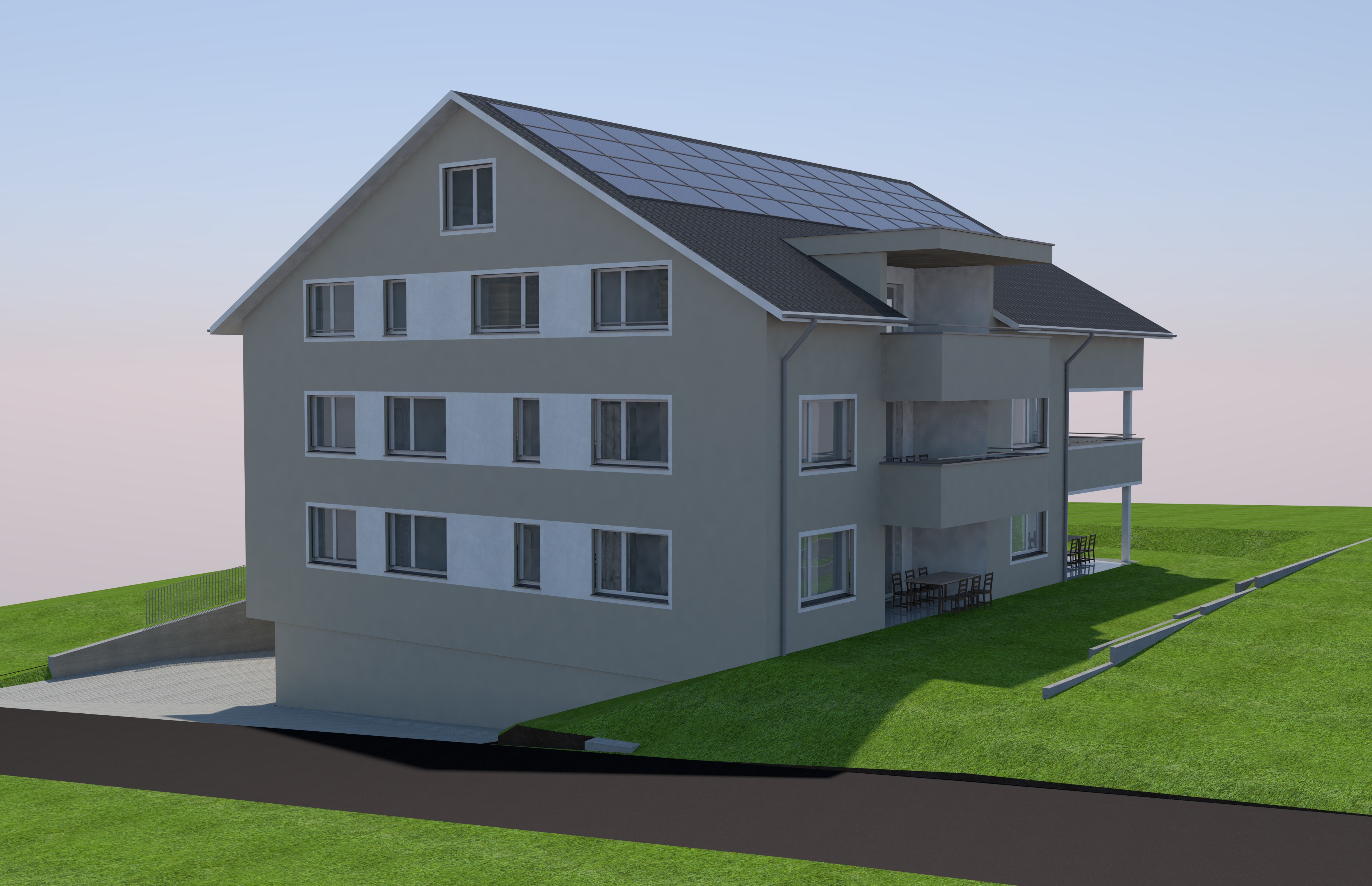 modernist exterior shot modern forest reality plastered beige windows white green erea must be garden lawn architecture
