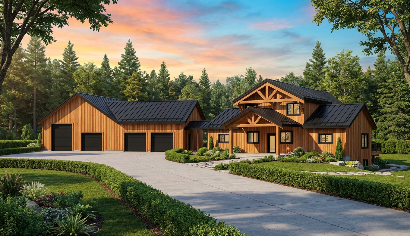 on the shore of a medium size lake in northen minnesota sits a sweet cabin with wood color lap siding and vertical accents of corrugated metal a coule of tall pines in the forground and a rugged pathway down to the lake shoreline