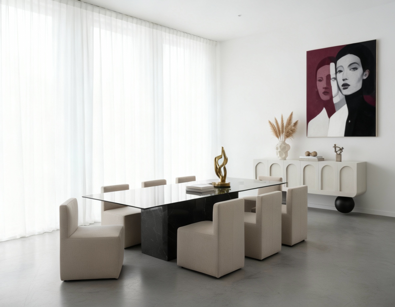 remove the plants add a big mirror with irregular golden frame portrait orientation on the wall remove the leafs acessories from the buffet add a brass acessories sculpture on the center of the buffet add a pendant lighting in the shape on wave in burgundy color over the table