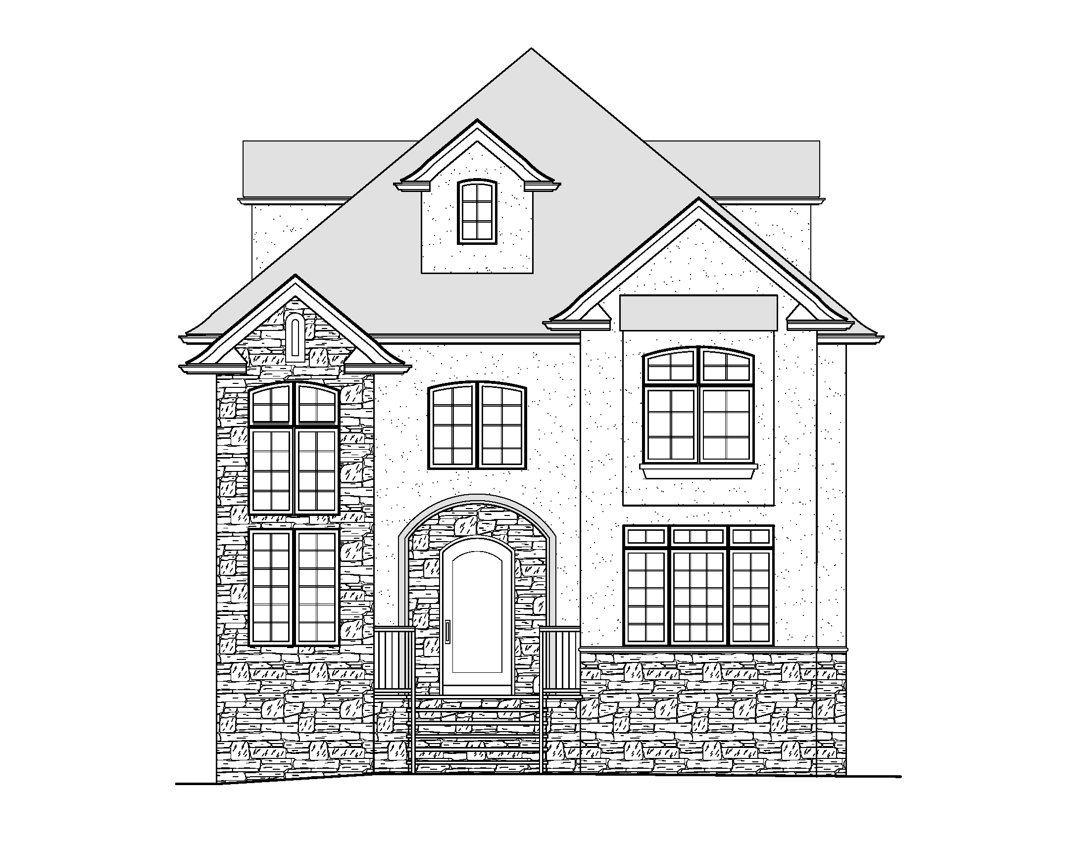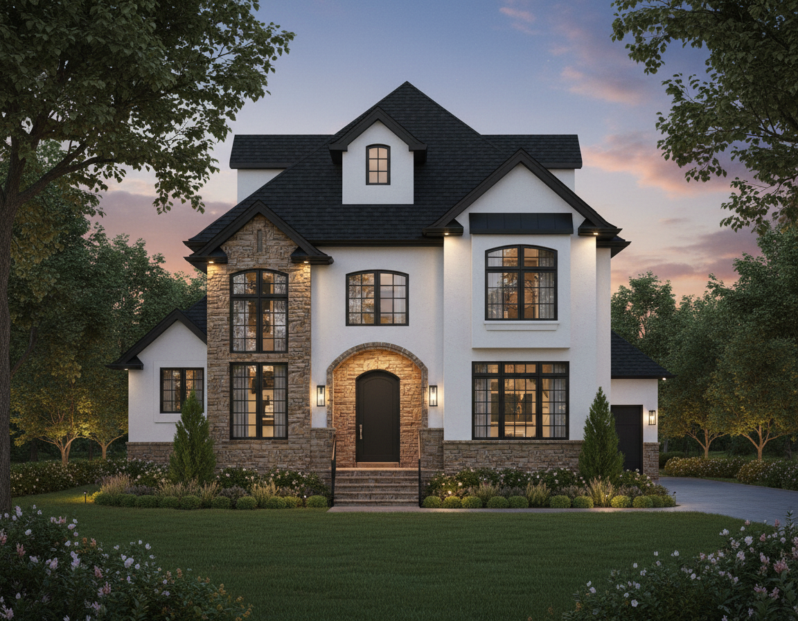 render realistic using white stucco with mixed brown color stone and black windows black accents black doors and black roofs set this is a residential neighborhood with large mature trees and very upscale landscaping provide shrubs and landscaping around the base of the house make the surround of the front door black and make the time of day dusk with lights add outdoor lighting next to front door and lighting in the soffits add a driveway going to the side yard on the right side stop adding more building on the right side and left side