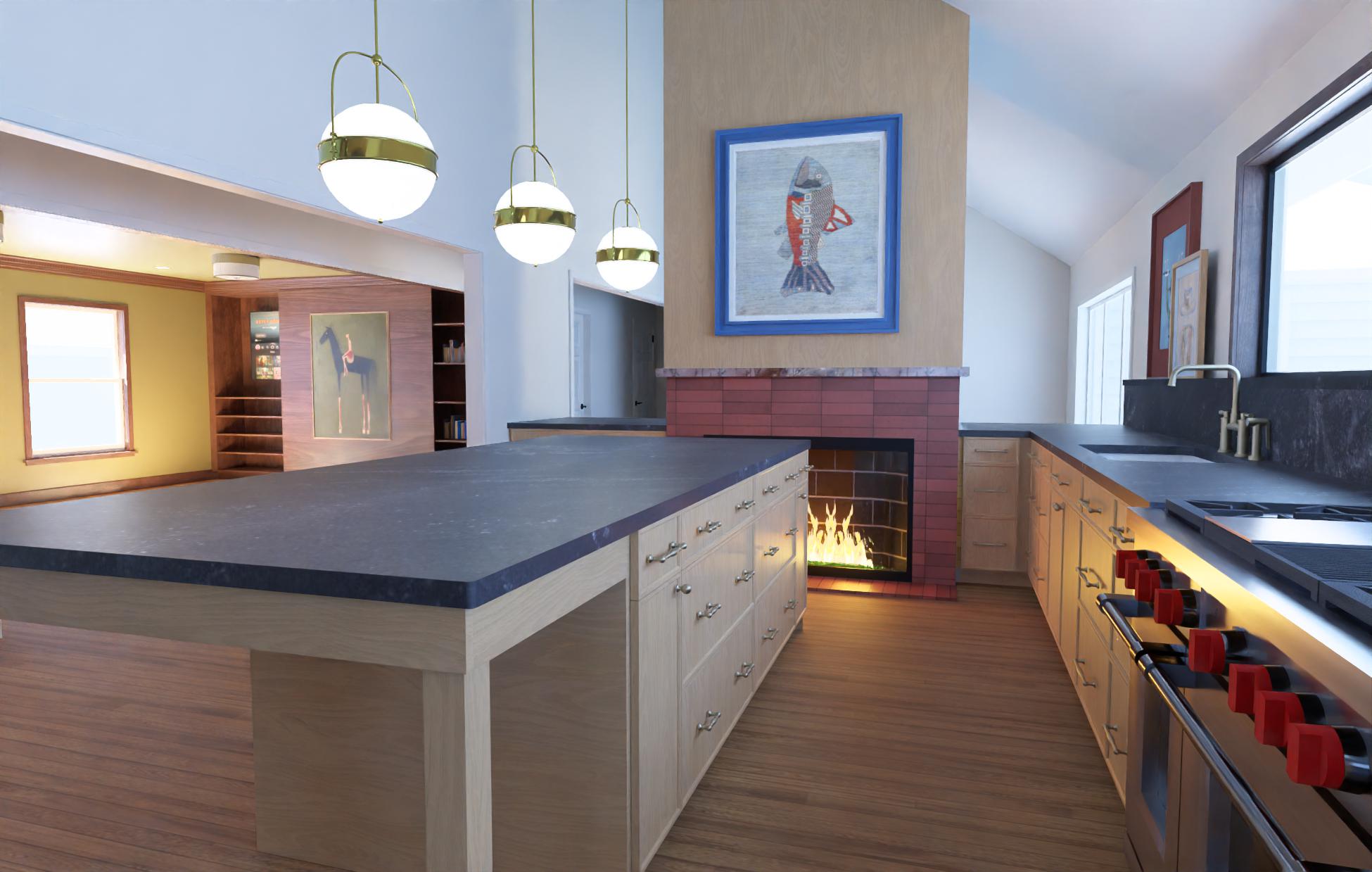 make this photo real and have someone walk through the kitchen