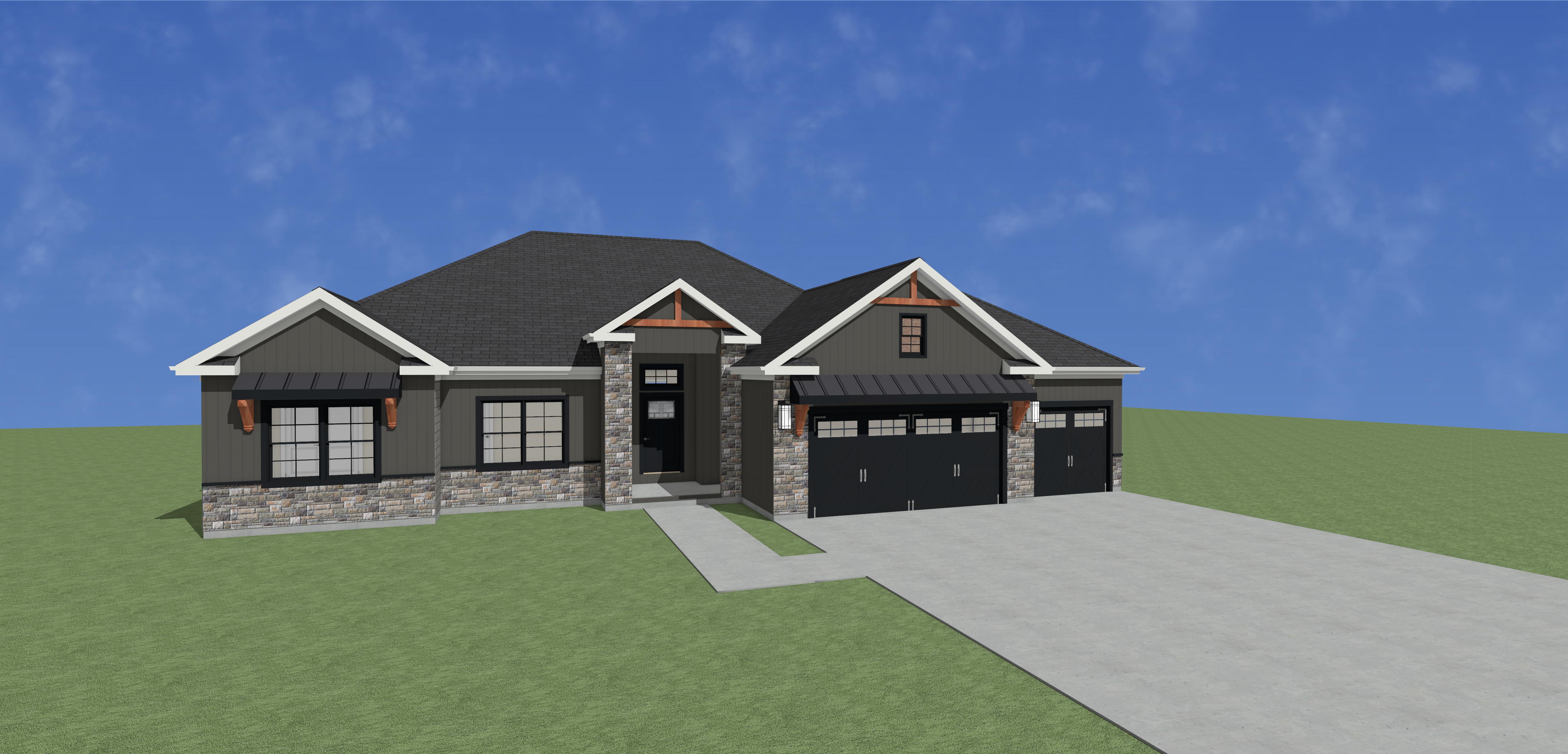 create a full color photorealistic rendering of this home elevation include driveway and landscaping the home is on large lot with a long driveway so there will not be homes close by next door use a modern dark gray color scheme with board and batton siding the window sashes are black