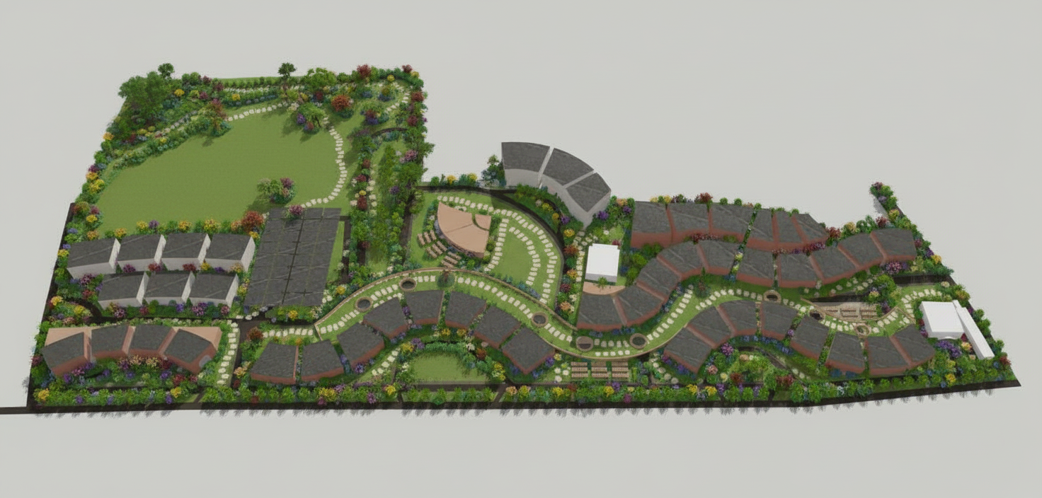 archsynth prompt strict masked intervention only use the provided image as the base image critical rule maintain the base photo exactly as it is do not alter enhance reinterpret recolor relight or modify any part of the image except the areas explicitly designated by color no global changes are allowed intervention rules mandatory intervene only inside the color highlighted areas do not change existing buildings existing geometry existing materials existing colors lighting or shadows camera angle or perspective do not add people vehicles or street furniture unless explicitly requested match scale perspective and camera angle of surrounding buildings exactly red areas pavement landscaping in the red highlighted areas add pavement use the exact same pavement material already present elsewhere in the image replicate texture color scale and pattern from surrounding paved areas add light landscaping only low planting grass or subtle greenery no dramatic gardens or decorative features do not introduce new pavement types or colors purple area hotel building in the purple highlighted area insert one new building building type modern hotel height 5 stories architectural character modern contemporary bali bamboo inspired natural materials vertical rhythm light airy expression match perspective camera angle scale urban alignment with surrounding buildings exactly the building must sit naturally within the existing city fabric do not alter adjacent buildings or streets blue area hospital building in the blue highlighted area insert one hospital building height 5 stories architectural character calm restrained contemporary subtle bali bamboo influence less expressive than the hotel match surrounding building view angle scale proportions the hospital must integrate quietly into the urban context yellow strip road edge treatment the yellow strip represents the side of a road add pavement using the same material as the red areas trees along the road edge tree placement follow the same spacing scale and rhythm as trees along other roads in the image maintain consistent urban planning logic do not introduce new tree species or landscape styles final absolute constraints do not modify any area outside the colored zones do not change global color balance or saturation do not add atmosphere fog sky changes or lighting effects do not stylize the image this task is surgical insertion only not a redesign