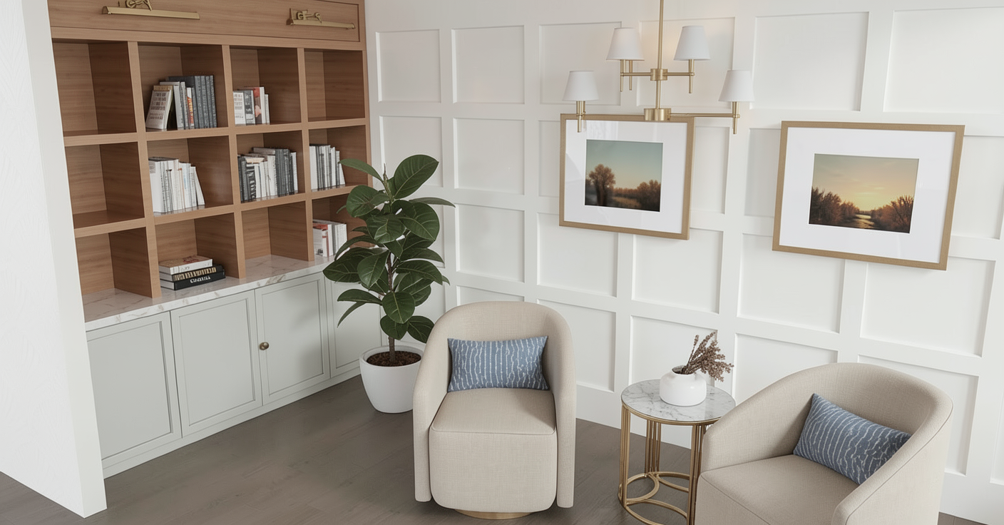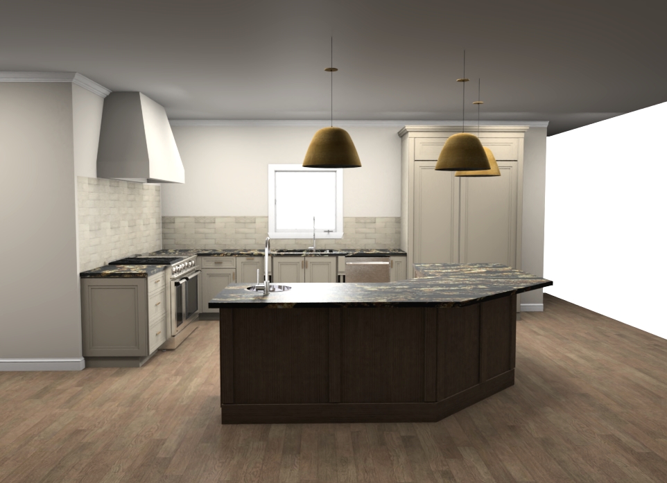 create a hyper realistic image from this kitchen renderings cabinets are accessible beige with a white oak island transitional modern style add two floating shelves on each side of the window natural light with sunlight add two leather counter stools to each section of the island six total stools