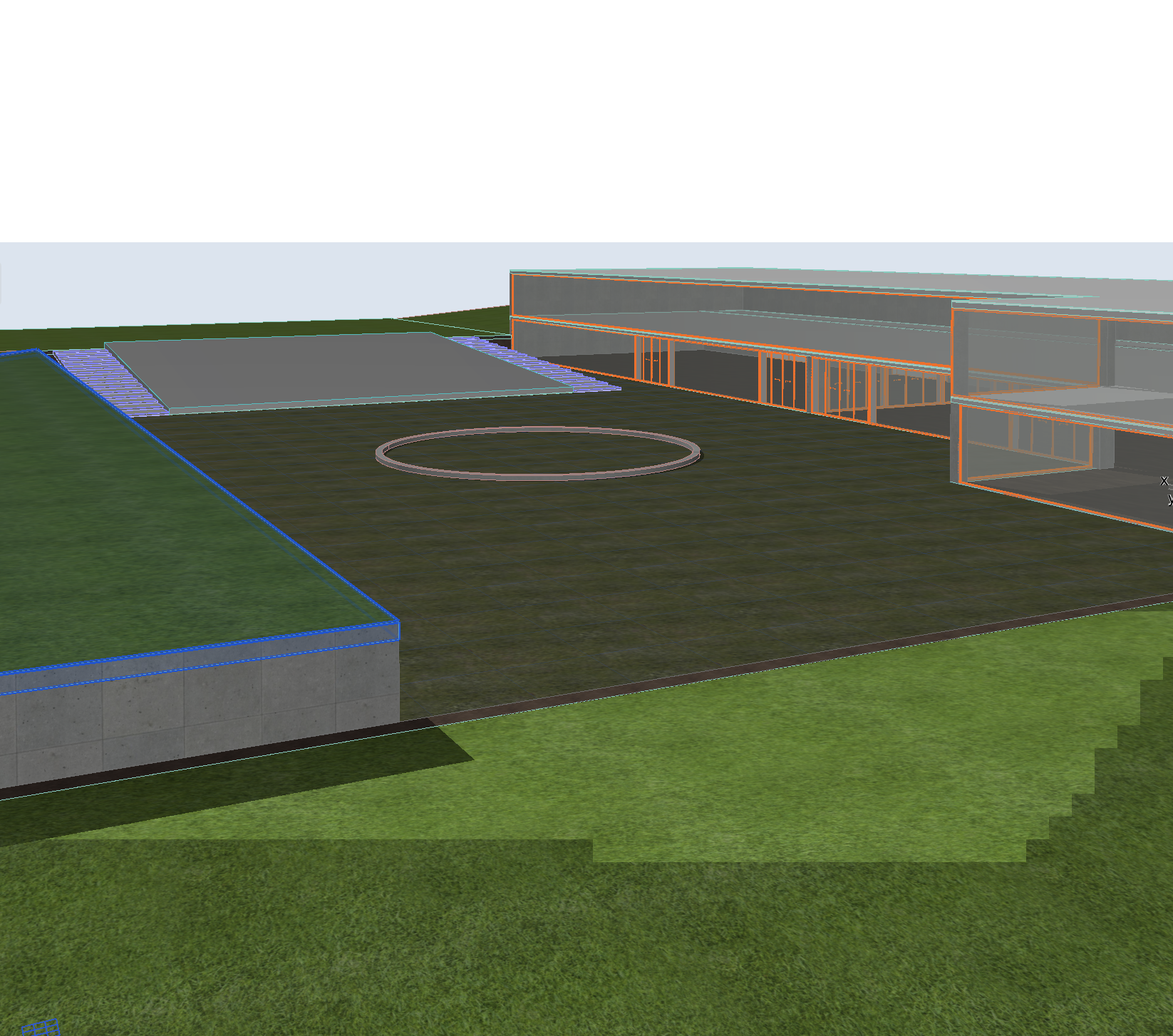 exterior shot a modern architectural building with a sleek minimalist design the structure features large glass windows bordered by thin orange frames creating a striking contrast against the light gray concrete walls the surrounding landscape is covered in lush green grass providing a natural base the atmosphere is serene and peaceful with a clear blue sky above enhance the image with soft natural lighting to highlight the textures and colors while maintaining a calm and inviting environment architecture