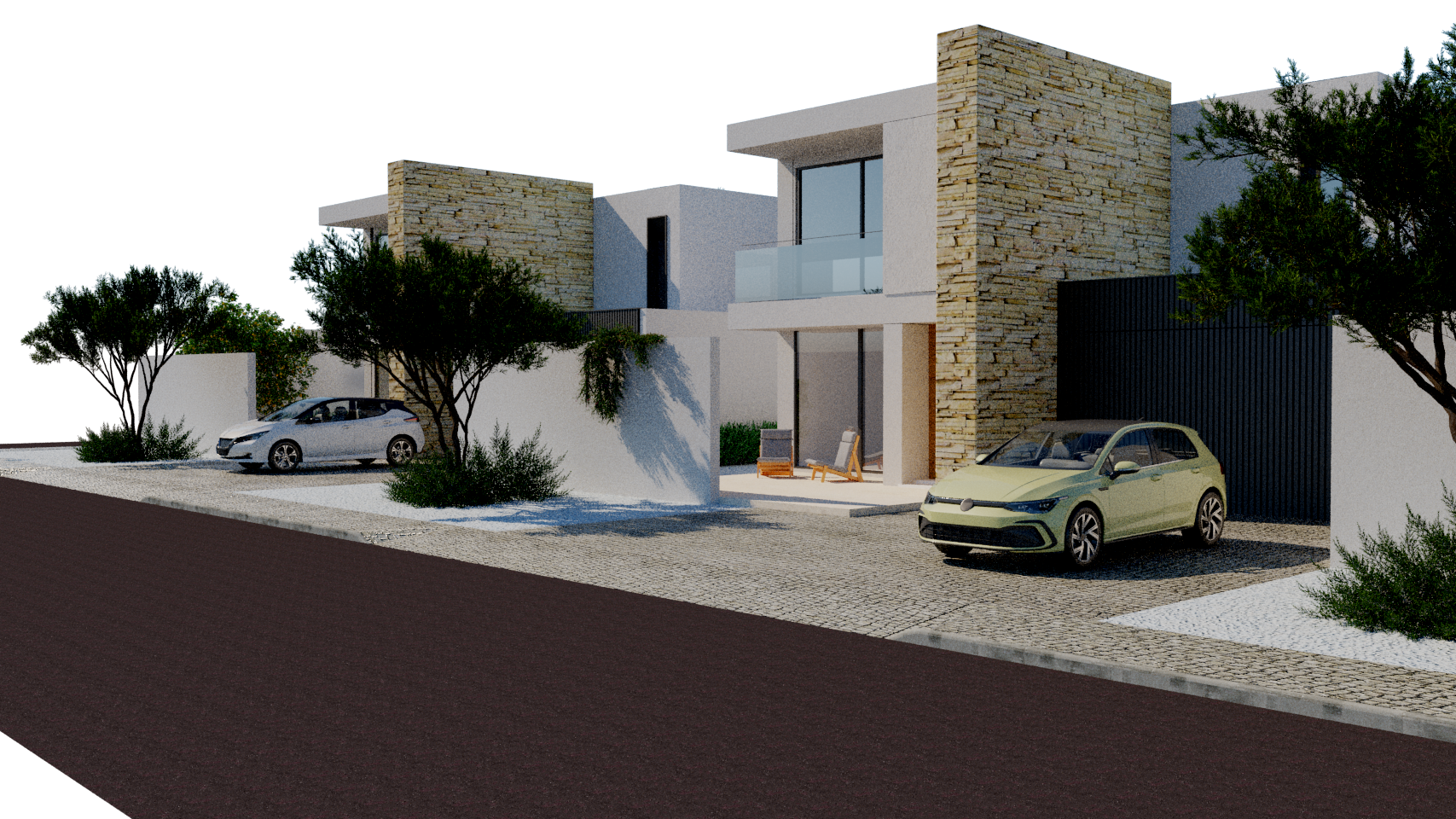 type of image ultra realistic architectural editorial photograph high end residential project archsynth style visualization scene framing street level perspective slightly low angle 3 4 frontal view of two contemporary mediterranean villas wide horizontal framing foreground includes asphalt road and cobblestone pedestrian area natural depth leading towards background landscape architecture elements modern cubic villas with clean volumes combination of white rendered walls and warm beige natural stone cladding thicker window frames visible depth and shadow dark aluminum finish large sliding glass panels with clear reflections covered entrance porch with minimalist outdoor furniture wood neutral fabrics carport with vertical dark slatted metal screen two parked modern compact cars subtle not dominant materiality white fa ades with subtle monolayer render effect slightly textured matte not overly rough natural stone cladding with horizontal stratification warm tones cobblestone pavement in light beige tones gravel garden areas replacing traditional grass mediterranean xeriscape concrete elements smooth but slightly weathered landscape design dry mediterranean garden with gravel base scattered low shrubs olive trees with light airy foliage background flat mediterranean terrain transitioning into distant soft mountains add sparse pine trees not too dense elongated trunks light canopy minimal vegetation density clean and controlled composition lighting natural sunlight late morning or early afternoon soft shadows slightly warm tone balanced exposure no harsh contrast subtle global illumination with realistic light bounce on white surfaces color texture neutral and warm palette whites beige sand olive green slight desaturation for editorial realism micro texture visible on walls stone and pavement no over saturation cinematic subtle grading atmosphere calm refined mediterranean lifestyle mood slight atmospheric haze in the background for depth clean air no dramatic sky style architectural digest style contemporary european editorial photography photorealistic not stylized cgi lens 35mm realistic depth of field sharp focus across main plane quality rendering ultra detailed 8k resolution physically accurate materials soft global illumination ray tracing realistic reflections no noise no artifacts restrictions negatives no exaggerated textures no overly dramatic lighting no dense vegetation no futuristic elements no people no distortions in geometry no overexposed whites